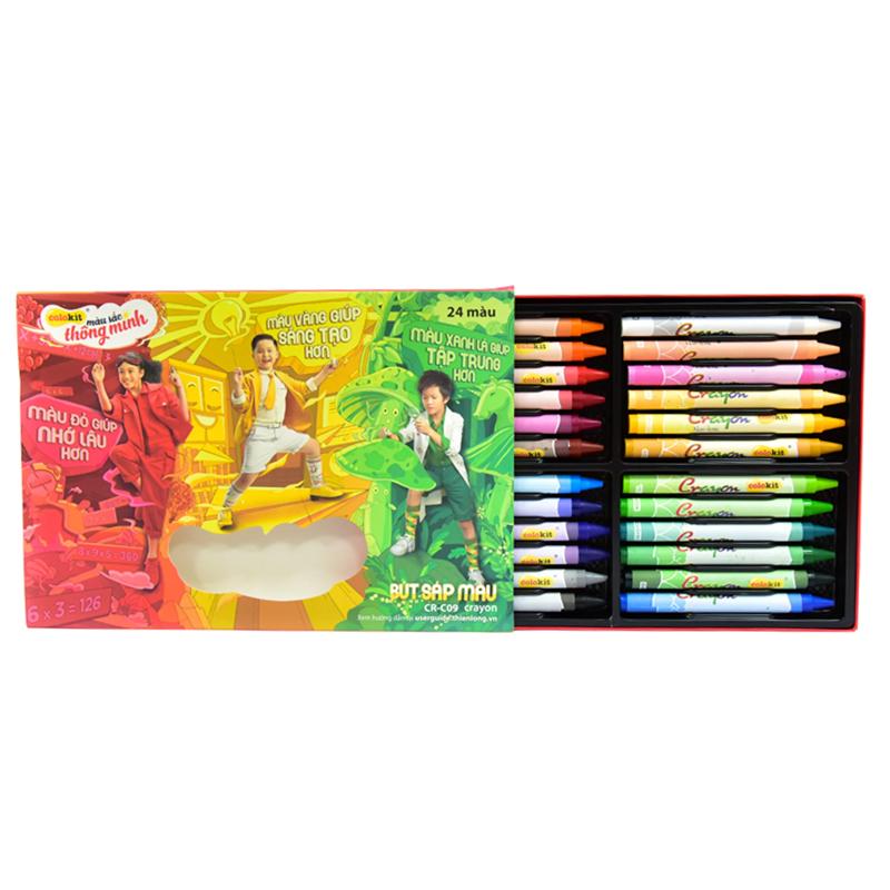 Sáp Bóp 24M CR-C09 - Bao bì hộp sản phẩm Sáp màu CR-C09 được làm theo tông màu Colokit, thiết kế theo sở thích của các bé. - 24 cây sáp có 24 màu (khác nhau) thông dụng trên thị trường, được cố định trong khay định hình, tránh trường hợp bị lẫn màu khi tô. - Mẫu mã đẹp, tông màu tươi sáng phù hợp cho các bé. - Sản xuất đạt tiêu chuẩn theo tiêu chuẩn xuất khẩu sang Châu Âu. - Khi vẽ/tô rất mịn, ăn màu tốt trên giấy vẽ thông dụng. - An toàn sức khỏe: Màu vẽ không gây dị ứng cho da, không độc hại khi các bé lỡ ngậm phả - Hình chữ nhật, hộp giấy, bên trong có khay định hình giữ các cây sáp được cố định tránh trường hợp vụng về hay làm mất của trẻ để các cây sáp không bị rơi ra ngoài. - Có tem dán trên thân mỗi cây sáp giúp nhận diện để phân biệt màu sắc rõ ràng hơn. - Tem nhận diện màu rõ ràng, phù hợp với lứa tuổi nhỏ -> tạo kích thích màu sắc, giúp bé nhận diện màu sắc tốt hơn .