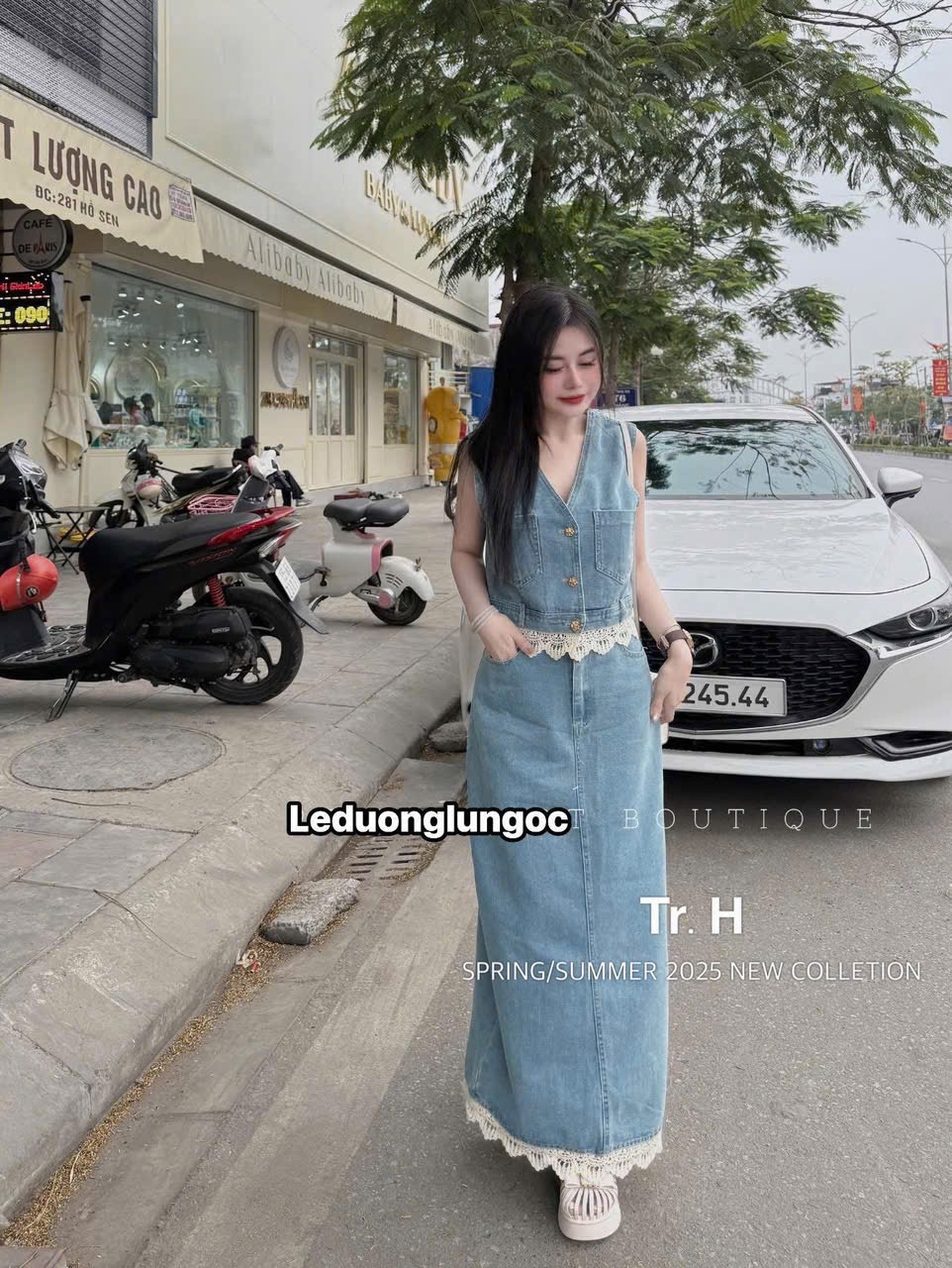 Thiết kế gồm áo sát nách cổ V và chân váy jean dáng dài. Điểm nhấn ren viền tinh tế, tạo phong cách nhẹ nhàng, nữ tính. Chất liệu jean mềm, dễ mặc, giữ