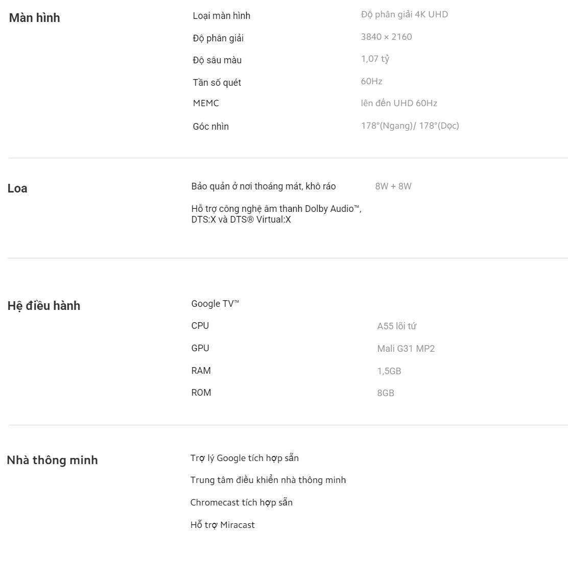 - Tổng quan sản phẩm - Loại Tivi:Google Tivi - Kích cỡ màn hình:55 Inch - Độ phân giải:4K (Ultra HD) - Hệ điều hành:Google TV - Công nghệ hình ảnh - Công nghệ hình ảnh - Dolby Vision IQ - HDR 10+ - Imax enhanced - Free sync - Filmmaker - Bộ xử lý:Cortex-A73*4 - Công nghệ âm thanh - Tổng công suất loa:25W (2 X 12.5W) - Số lượng loa:2 - Âm thanh vòm - Dolby Audio - Dolby Atmos 1 - DTS-X - Cổng kết nối -