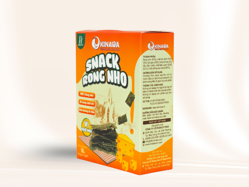 - Thành phần: Rong nho (85%), bột phô mai (4%), bột gia vị, chất ổn định (E1422), dầu đậu nành, chất bảo quản (E202, E211), chất chống oxy hóa (E307c). - Công dụng: + Giúp
