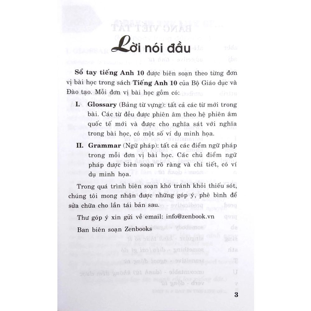 SỔ TAY TIẾNG ANH 10 sẽ giúp bạn tóm tắt kiến thức ngữ pháp cơ bản của Tiếng Anh; bảng động từ bất quy tắc đầy đủ nhât; cấu trúc câu trong Tiếng Anh và giới thiệu đến bạn những tình huống giao tiếp thông dụng trong Tiếng Anh