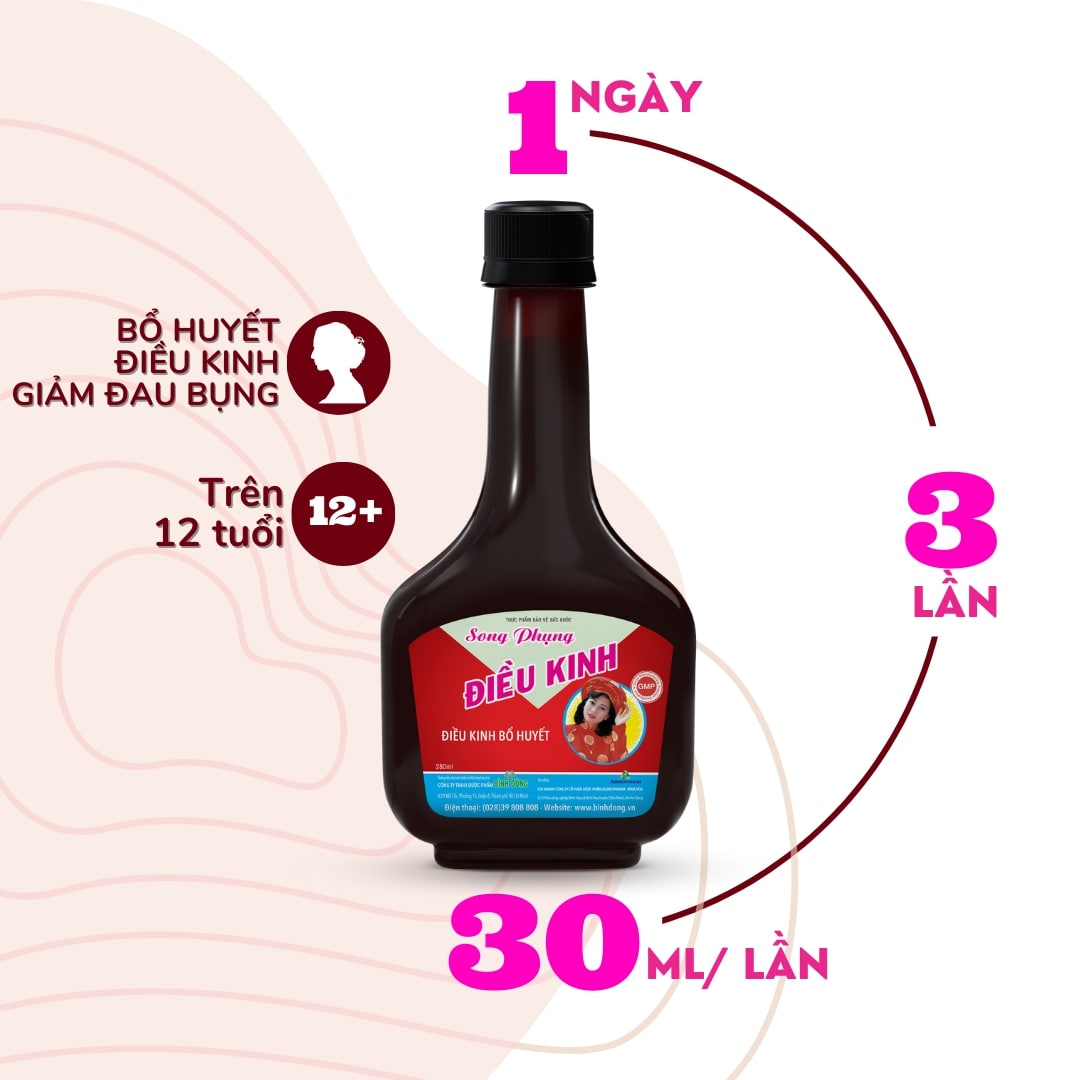 - Giảm triệu chứng và tình trạng thường gặp khi đến kỳ kinh nguyệt như: đau bụng kinh, mệt mỏi,… Đối với phụ nữ, Song Phụng Điều Kinh của Dược Bình Đông sẽ mang lại giải pháp hiệu quả nhằm hỗ trợ giảm triệu chứng rối loạn kinh nguyệt, để những “ngày dâu” không còn lo lắng Nhà phân phối: Công ty TNHH Dược Phẩm Bình Đông Số công bố: 7733/2020/ĐKSP Hạn sử dụng: 36 tháng kể từ ngày sản xuất (được in trên bao bì) Quy cách: Chai 280ml cao lỏng THÀNH PHẦN Hương phụ – 16.8g Ngải diệp – 16.8g Ích mẫu – 11.2g Xuyên khung – 5.6g Thục địa – 5.6g Đương quy – 2.8g Bạch thược – 2.8g Xuyên đại hoàng – 2.8g Bạch phục linh – 2.8g Phụ liệu: Đường kính, Natri benzoat, nước tinh khiết vừa đủ.