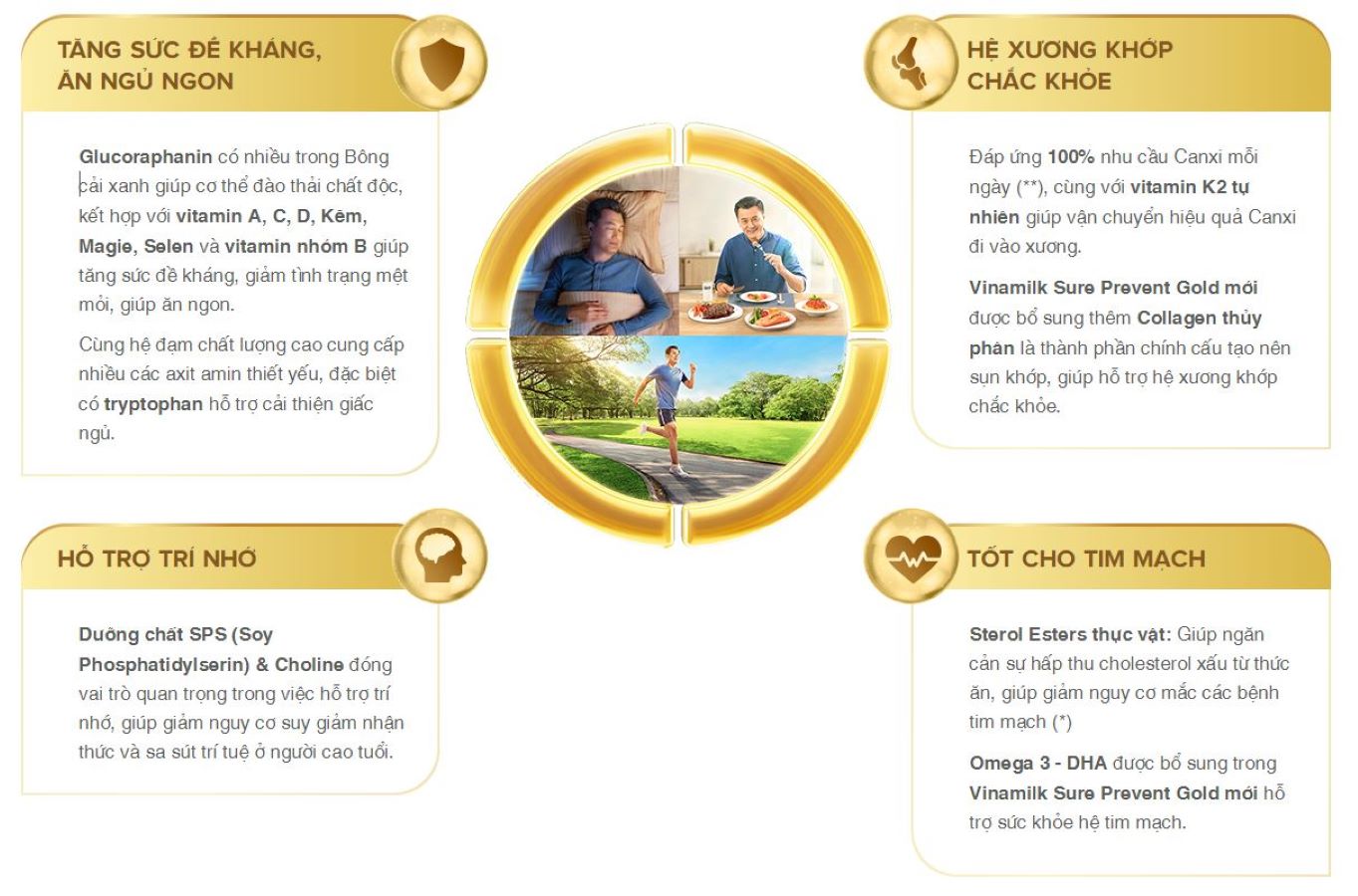 - Tạo hệ xương chắc khỏe: tỉ lệ phù hợp giữa Canxi: Phốt pho: Vitamin D giúp tăng cường hấp thụ Canxi, tạo hệ xương chắc khỏe. Uống 02 ly Vinamilk Sure Prevent mỗi ngày đáp ứng được lượng Plant Sterol theo khuyến nghị của FDA Hoa Kỳ. Sản phẩm được bổ sung dưỡng chất Glucoraphanin – chiết xuất tự nhiên từ mầm Bông cải xanh có tác dụng thúc đẩy và duy trì các phản ứng chống oxi hóa, giúp đào thải độc tố trong cơ thể, từ đó giúp tăng sức đề kháng, giảm mệt mỏi, ăn ngủ ngon. (*) Theo Cơ quan quản lý thuốc và thực phẩm Hoa Kỳ FDA, thực phẩm chứa ít nhất 0,65g các sterol ester thực vật trên một khẩu phần với liều dùng 02 lần mỗi ngày cùng chế độ ăn ít béo no và ít cholesterol giúp giảm nguy cơ mắc các bệnh tim mạch. 01 ly Vinamilk Sure Prevent cung cấp 0,65g các sterol ester thực vật. Thành Phần Maltodextrin, dầu thực vật, đạm đậu nành, đường, chất xơ hòa tan oligofructose (FOS), natri caseinat, các khoáng chất (kali citrat, tricalci phosphat, calci carbonat, natri clorid, dikali phosphat, magnesi phosphat, magnesi oxyd, sắt pyrophosphat, kẽm oxyd, mangan sulfat, đồng sulfat, crôm clorid, natri molybdat, kali iodid, natri selenit), đạm whey cô đặc, collagen thủy phân, xirô glucoza, sterol esters thực vật (1,3%), hương liệu tổng hợp dùng cho thực phẩm, cholin clorid, DHA từ dầu cá, chất nhũ hóa (322(i), 471), các vitamin (natri ascorbat, E, niacin, calci D-pantothenat, hỗn hợp tocopherol, ascorbyl palmitat, B6, B1, B2, A, acid folic, beta-caroten, K1, K2, biotin, D3, B12, acid ascorbic), phosphatidylserin đậu nành, taurine. Hướng dẫn sử dụng