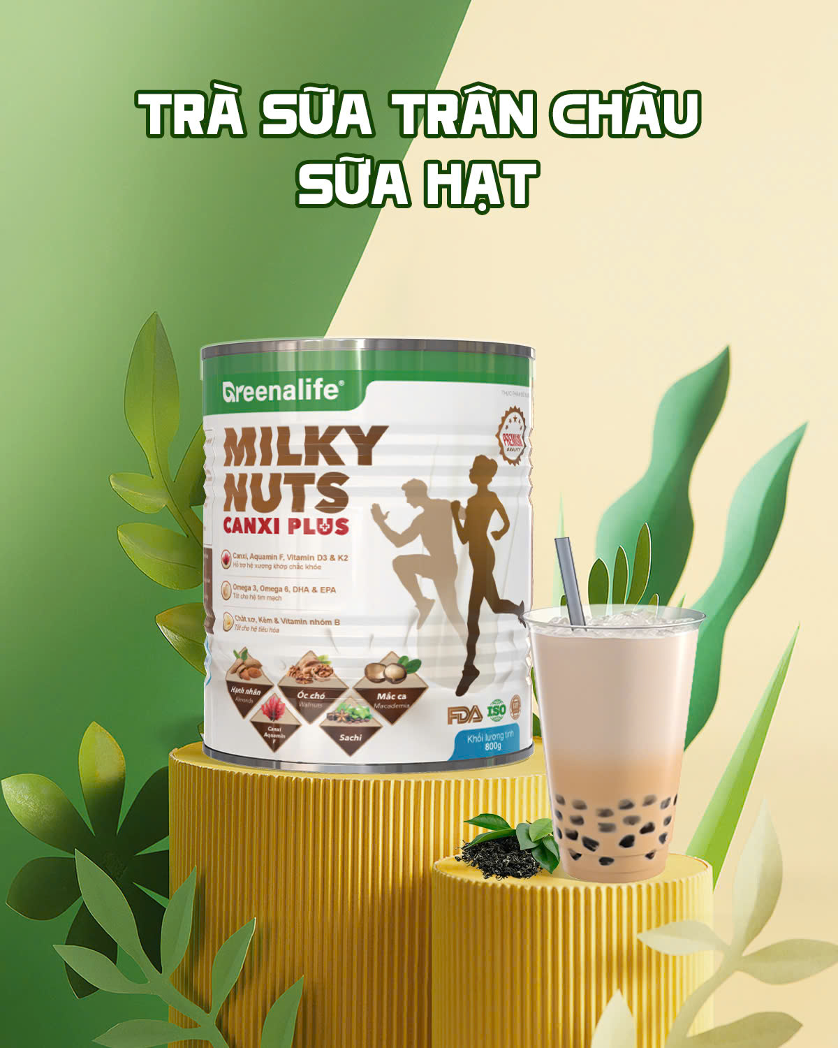 Tên sản phẩm: Sữa hạt Canxi Plus Milky Nuts Greenalife  Milky Nuts - Canxi Plus - được kết hợp từ hạnh nhân, óc chó, mắc ca, đậu nành,... cùng Canxi Aquamin F, các khoáng chất như Magie, Kẽm và Vitamin D3,.... đã tạo nên một hỗn hợp dinh dưỡng đặc biệt hữu ích cho xương và khớp. Không chỉ hỗ trợ quá trình hình thành và tái tạo mô xương mà còn giúp duy trì cân nặng khoa học của cơ thể, giảm áp lực đối với xương khớp. Hơn nữa, chất xơ từ hạt còn hỗ trợ việc giảm viêm và cung cấp sự linh hoạt cho xương khớp. Bổ sung 2 ly Milky Nuts - Canxi Plus vào chế độ ăn uống hàng ngày để hỗ trợ sức khỏe xương khớp và đầy đủ dinh dưỡng cho toàn bộ cơ thể!