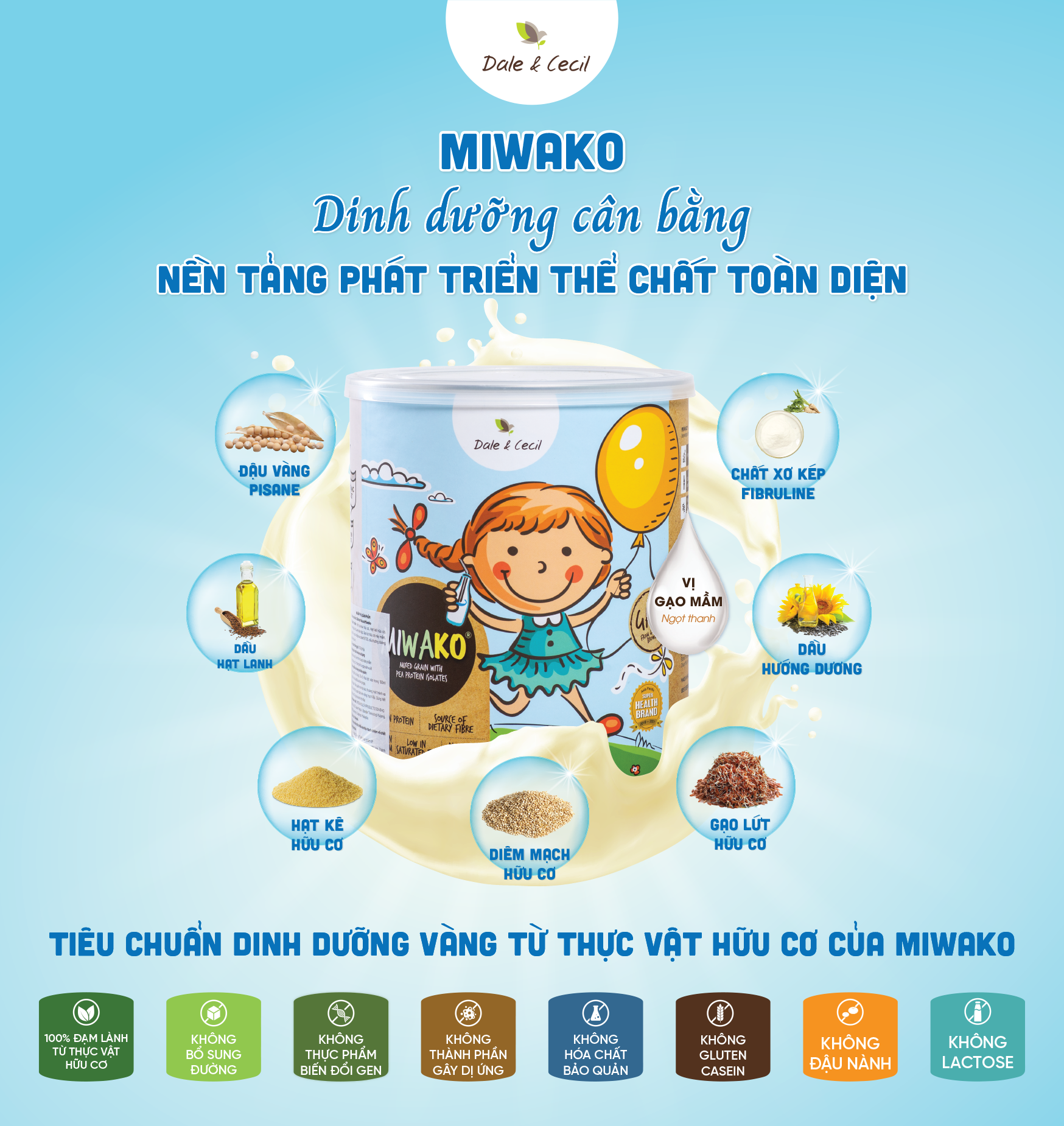 - Sữa hạt Miwako với nguồn đạm lành chất lượng cao từ thực vật hữu cơ được nhập khẩu từ Bỉ, cùng bộ ba siêu thực phẩm giàu dinh dưỡng bao gồm gạo lứt hữu cơ - hạt kê hữu cơ - quinoa hữu cơ và hệ chất xơ kép FOS và Inuline đem đến nguồn dưỡng chất cân bằng, đầy đủ dinh dưỡng và an toàn.