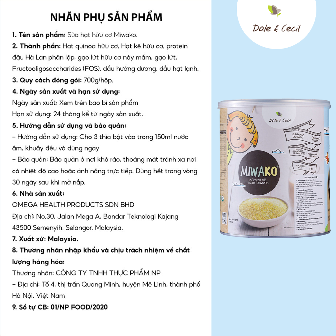 - Dòng đạm lành phân lập dễ tiêu hóa và hấp thu, đem lại cảm giác nhẹ bụng, không gây đầy bụng, khó tiêu. THÔNG TIN SẢN PHẨM SỮA HẠT MIWAKO Xuất xứ: nhập khẩu nguyên lon từ Malaysia Thương hiệu: Dale & Cecil Trọng lượng: 400g/700g Hương vị: vị gạo ngọt thanh dễ uống Đối tượng sử dụng: Trẻ từ 12 tháng tuổi, người trưởng thành và người lớn HSD: 2 năm kể từ ngày sản xuất NSX & HSD: In dưới đáy lon sữa kèm mã QR chính hãng