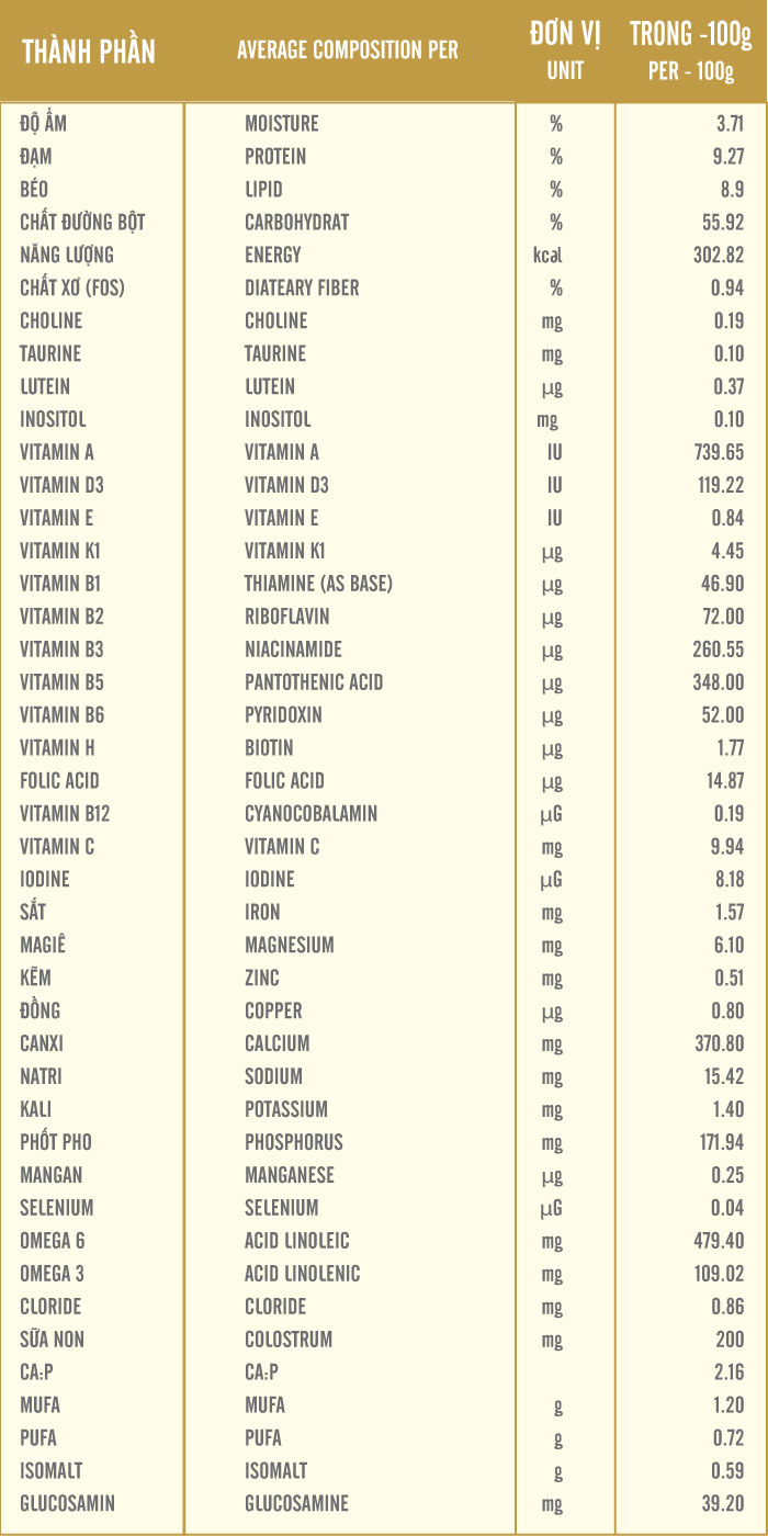 Thành phần: Sữa bột, Maltodextrin, Whey protein, FOS(chất xơ hòa tan), Sữa non, DHA, L-Lysine HCL, Choline, Taurine, Vitamin ( Vitamin A, Vitamin D3, Vitamin E, Vitamin K1, Vitamin C, Vitamin B1, Vitamin B2,