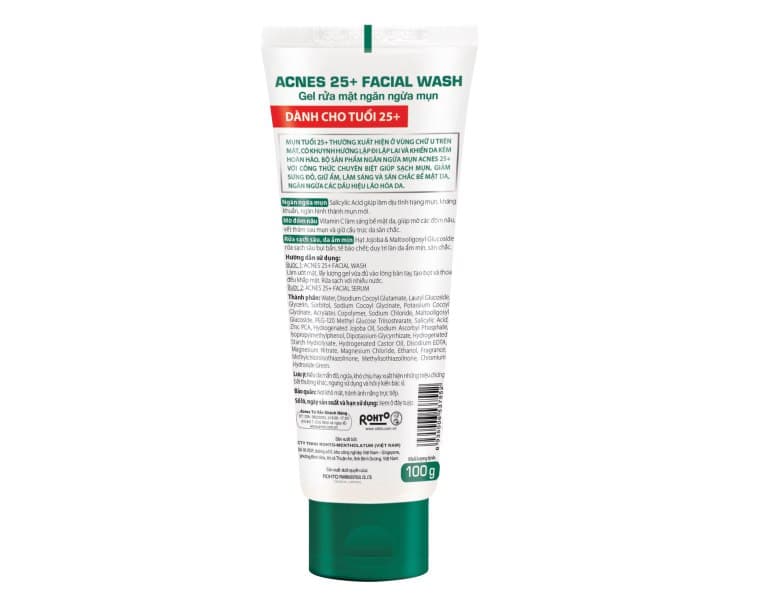 - Mụn tuổi 25+ thường xuất hiện ở vùng chữ U trên mặt, có khuynh hướng lặp đi lặp lại và khiến da khó phục hồi. Sữa rửa mặt Acnes 25+ với công thức chuyên biệt giúp sạch mụn, giảm sưng đỏ, giữ ẩm, làm sáng và săn chắc bề mặt da, ngăn ngừa các dấu hiệu lão hóa da.