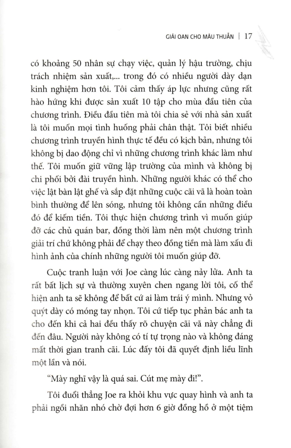 Thông qua bộ công cụ xây dựng mâu thuẫn tích cực của Taffer. cuốn sách này là nỗ lực của tác giả gửi gắm đến cho bạn một số cách tiếp cận mâu thuẫn có chiến lược – làm thế nào để bạn chủ động đối mặt chứ không còn bị động phản ứng nữa. Để tận dụng được sức mạnh của mâu thuẫn một cách chủ động, hiệu quả và có tính xây dựng.