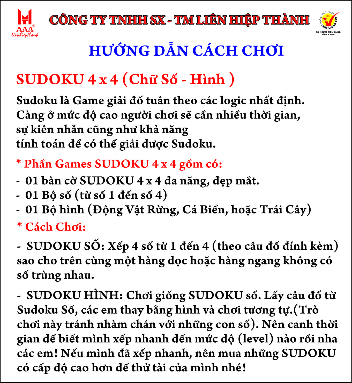 Gồm 3 loại: Cờ Tiến, Mê Cung, Tranh ghép Kích thước bàn 260 mm ± 1 x 200 mm ± 1 Kích thước tranh ghép: 200 mm ± 1 x 300 mm ± 1 Thành