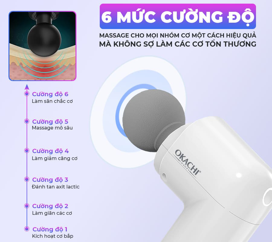 Súng massage OKACHI JP-G3 cung cấp 6 cường độ massage khác nhau, từ nhẹ đến mạnh nhất, đáp ứng mọi nhu cầu từ thư giãn đến giảm đau, săn cơ, phục hồi cơ.