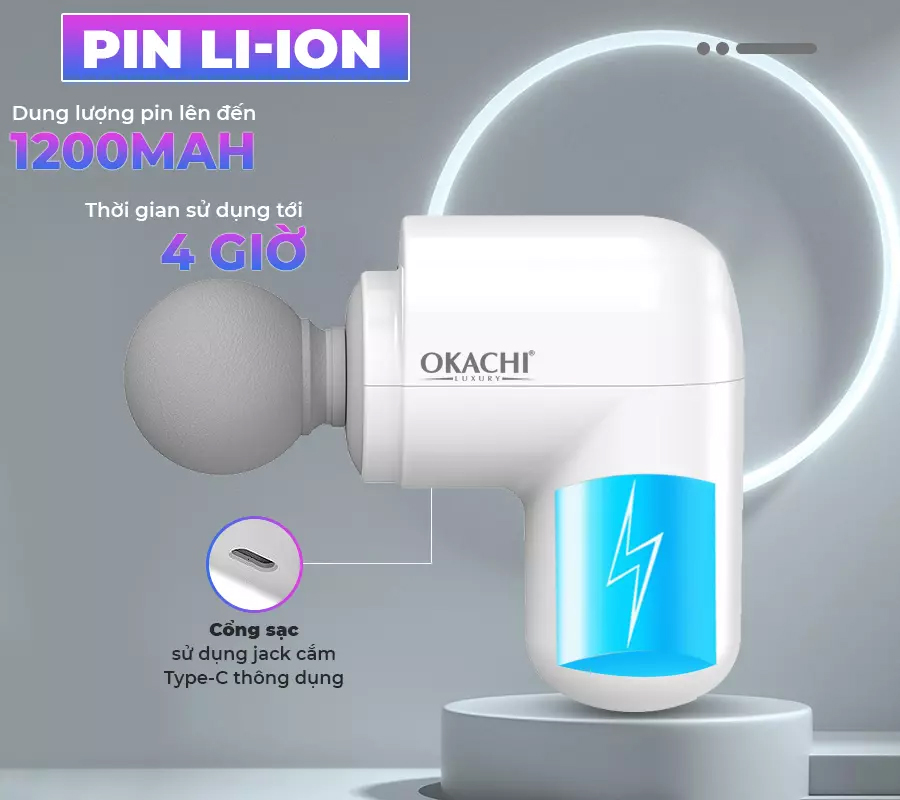 Pin sạc Li-ion dung lượng lớn đến 1200mAh giúp sử dụng lâu dài khoảng 3 hoặc 4 giờ tùy theo cường độ sử dụng. Pin sạc tiện lợi cho phép người dùng mang theo và massage ở mọi nơi, từ phòng tập, sân vận động, văn phòng, nhà ở đến các nơi công cộng.