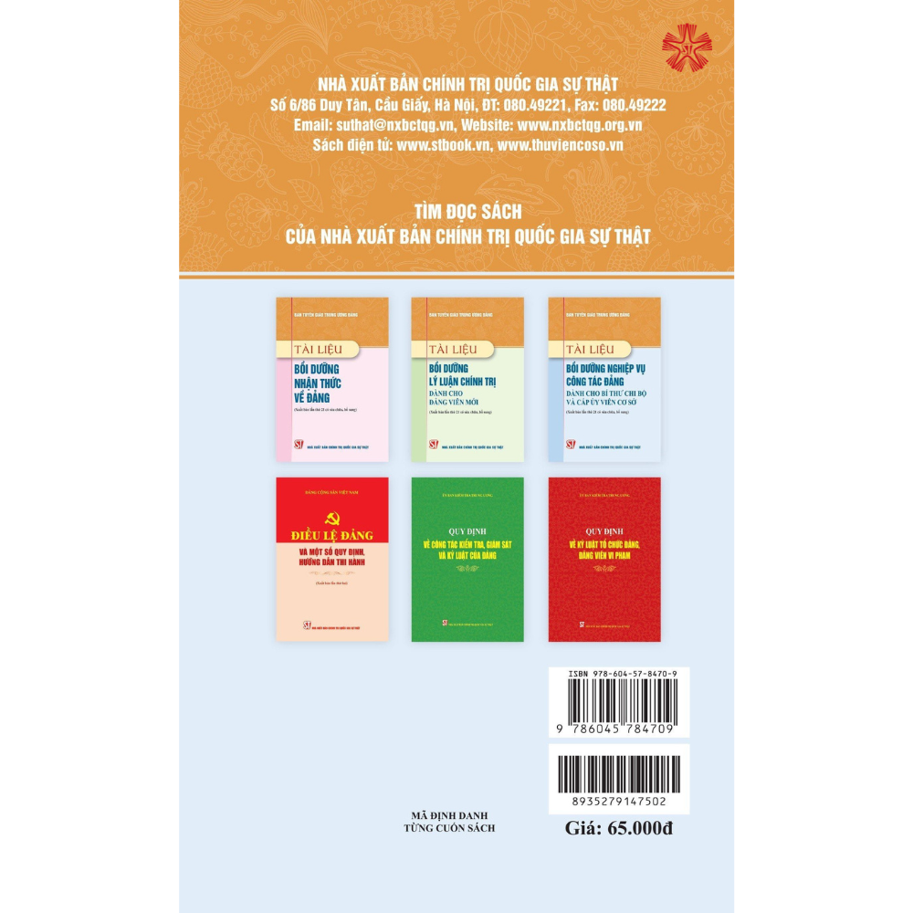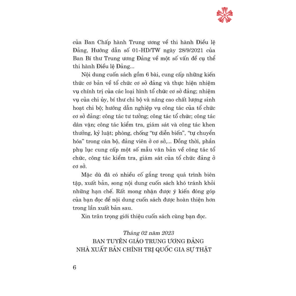 Mua tại TiktokNội dung cuốn sách gổm 6 bài, cung cấp những kiến thức cơ bản về tổ chức cơ sở đảng và thực hiện nhiệm vụ chính trị của các loại hình tố chức cơ sở đảng: nhiệm vụ của chi ủy, bí thư chi bộ và nâng cao chất lượng sinh hoạt chi bộ: hướng dẫn nghiệp vụ công tác của tổ chức cơ sở đảng: công tác tư tưởng; công tác tổ chức; công tác dân vận; công tác kiểm tra, giám sát và công tác khen thưởng, kỷ luật; phòng, chống "tự diễn biến”, “tự chuyển hóa" trong cán bộ, đảng viên ở cơ sở Đồng thời, phần phụ lục cung cấp một số mẫu văn bản về công tác tổ chức, công tác kiểm tra, giám sát của tổ chức đảng ở cơ sở.