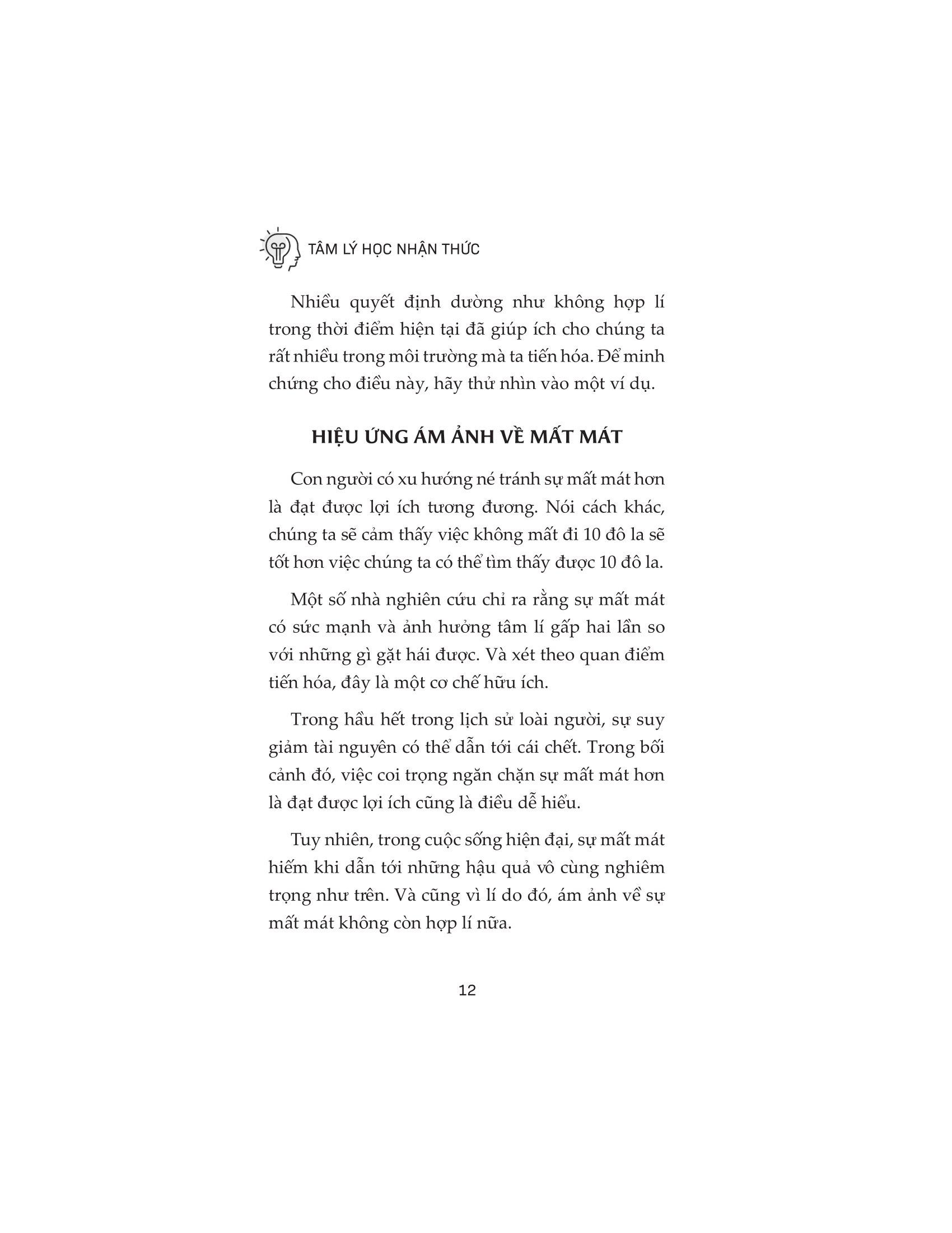 Nguyên nhân của tất cả những vấn đề được kể trên là vì thiếu kỹ năng ra quyết định. Chúng ta thiếu nhận thức về sự tác động của tâm trí và cảm xúc đến khả năng phân tích, tư duy logic và ra quyết định sáng suốt của chúng ta. May mắn là bạn có thể khiến não bộ rèn luyện khả năng tư duy theo phương thức mới hiệu quả hơn, nhận thức các yếu tố tâm lý tác động đến lựa chọn của chúng ta hay những sai lầm trong tư duy thường có. Và trong “Tâm lý học nhận thức”, tác giả sẽ chỉ ra cho bạn thấy phương thức thực hiện một cách chính xác. Kết nối tâm trí, kiểm soát cảm xúc và nỗ lực phát triển bản thân, qua từng ngày, bạn sẽ cải thiện lối tư duy, đưa ra những quyết định đúng đắn hơn, thông minh hơn và từng chút cân bằng cuộc sống.