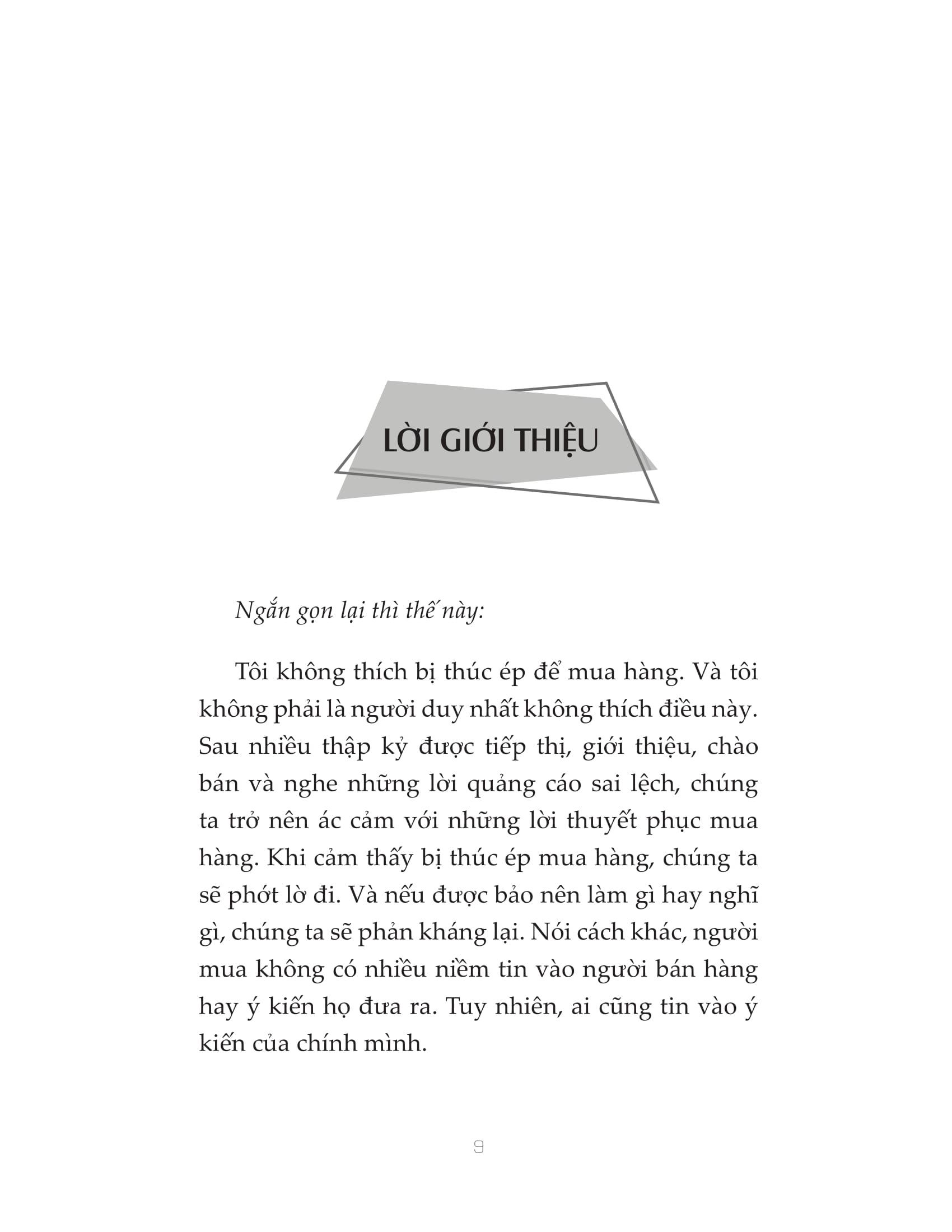 “Ngày nay, sản phẩm không phải để bán, mà là để mua.” Hoạt động bán hàng biến đổi hằng ngày và cách thức người mua thực hiện giao dịch cũng đang thay đổi cách thức người bán thực hiện chào hàng. Thay vì thúc ép dẫn đến kháng cự, cách hiệu quả hơn để chinh phục người mua là khiến họ bị thuyết phục và tự nguyện chi tiền. “Tâm lý học thuyết phục” cung cấp cho bạn phương pháp bán hàng hoàn toàn mới, không chèo kéo, không gây áp lực, giúp bạn có thể bán bất kỳ thứ gì cho bất kỳ ai.