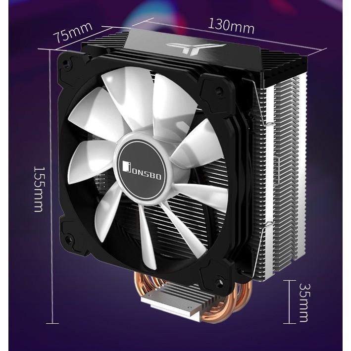 THÔNG SỐ KỸ THUẬT Hãng sản xuất: Jonsbo AMD AM2/AM2+/AM3/AM3+/AM4/FM1/FM2/FM2+ Kích thước bộ tản nhiệt: 155mm x 75mm x 130mm Kích thước quạt: 120mm x 120mm x 25mm Số lượng ống đồng dẫn nhiệt: 4