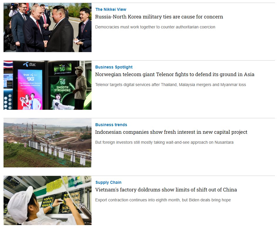 Nikkei Asia là tạp chí bằng tiếng Anh rất uy tín của Nikkei - Nhật Bản, chuyên viết về Xu hướng khu vực châu Á - Thái Bình Dương, Kinh tế, Công nghệ, Chính trị,