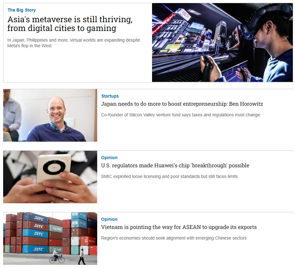 Nikkei Asia là tạp chí bằng tiếng Anh rất uy tín của Nikkei - Nhật Bản, chuyên viết về Xu hướng khu vực châu Á - Thái Bình Dương, Kinh tế, Công nghệ, Chính trị,