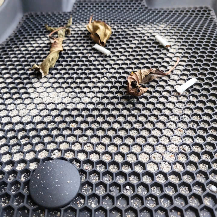 Lớp 2: Thảm tổ ong giấu bụi bằng cao su PBR (Polybutadiene Rubber): Chất liệu cao su PBR dẻo dai, độ đàn hồi cao, chống mài mòn cực tốt, không mùi, thân thiện với môi trường và sức khỏe. Thiết kế tổ ong 3D thông minh giúp giấu bụi, giữ lại rác và đất cát mà không bị lộ ra ngoài. Khả năng bám sàn tốt, giúp thảm không bị xô lệch khi sử dụng. Có thể tháo rời dễ dàng để vệ sinh riêng, giữ cho lớp dưới luôn sạch sẽ.