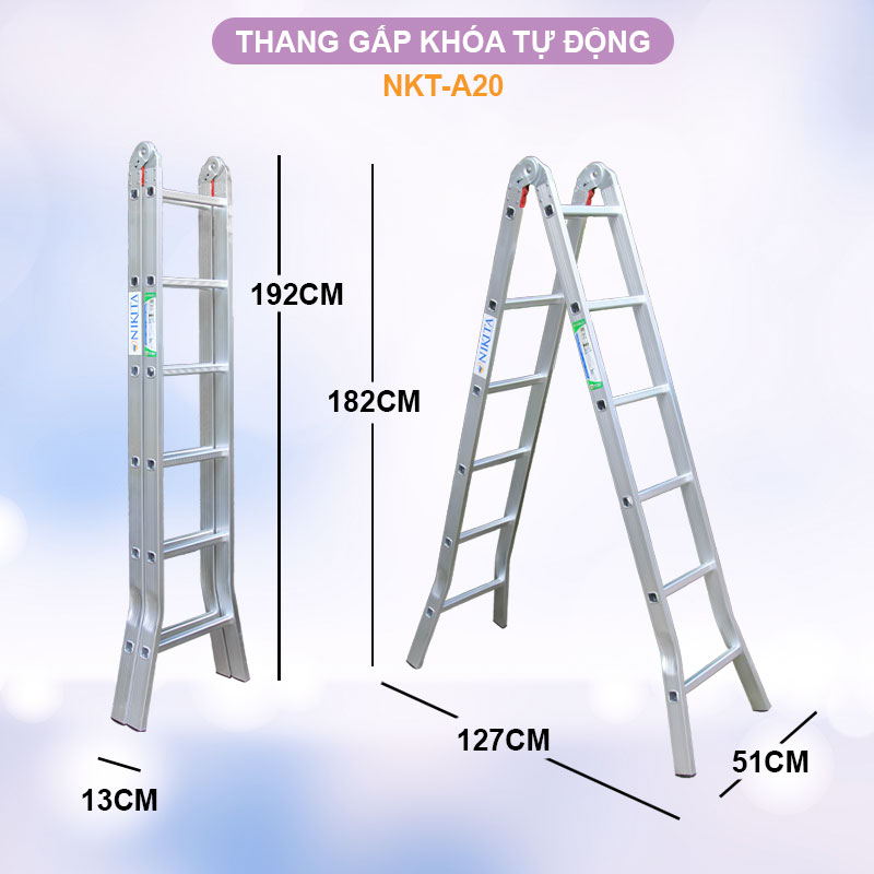 Mua tại TiktokThang nhôm Nikita NKT- NIKA20 Số lượng bậc: 6 bậc mỗi bên Chiều cao duỗi thẳng chữ I: 4 m Chiều cao chữ A : 1.9 m Trọng lượng: 7.2kg Công nghệ dập của Đức, Tải trọng 150 kg Khoảng cách giữa các bậc: 29cm Bản nhôm: 6.3cm Độ dày của nhôm 1.3mm Tiêu chuẩn an toàn Châu Âu: EN131 Màu thang: nhôm Trắng nguyên bản Bảo hành: 12tháng -Thang nhôm khóa sập tự động thế hệ mới mang nhiều ưu điểm được cải tiến hơn thang xếp truyền thống, với thang xếp truyền thống phần khóa thang cồng kềnh, khó sử dụng ít tư thế sử dụng. khóa thang mới được cải tiến cứng cáp hơn, gọn gàng hơn, nhiều tư thế sử dụng hơn và đặc biệt là tự động nhảy chốt khóa tư thế khi đến cỡ giúp người dùng sử dụng tiện lợi hơn -Khóa thang cứng cáp, gọn gàng, nhiều tư thế, tự động nhảy chốt khóa khi thang đến cở, mở khóa với 1 thao tác kéo lẫy đơn giản -Công nghệ dập nổi 3 ngấn cả 2 bên ống thang giúp các ống thang liên kết chắc chắn với thân thang. -Chân thang được gắn các cục chống trượt cao su, giúp thang bám chắc hơn với mặt sàn, chóng trượt, chống trầy sàn, tránh gây tiếng ồn khi kéo thang đi. -Nhiều tư thế sử dụng khác nhau cho tính ứng dụng cao, sử dụng được trong nhiều công việc. Cảm ơn quý khách đã giành thời gian quan tâm đến sản phẩm của Shop, kính chúc quý khách may mắn và thành công .