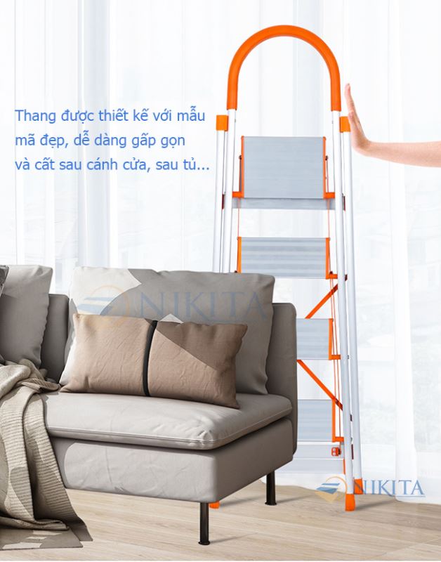 CHI TIẾT SẢN PHẨM CHI TIẾT SẢN PHẨM: Chiều cao sử dụng: 1.2 m Kích thước gấp gọn: 1.7 x 0.47 x 0.18 m Trọng lượng : 4 kg Số bậc : 06 bậc Kích thước bậc trên cùng: 13 x 24 cm Chất liệu : INOX Màu sắc : Trắng + Cam Tải trọng 150kg, tiêu chuẩn EN131 Thang tay vịn INOX được sản xuất theo mẫu Châu Âu  tiêu chuẩn EN 131, phần tay vịn được bọc nhựa tránh trơn trượt, đảm bảo an toàn khi sử dụng                                                   • CHÂN THANG: làm bằng cao su chịu lực có các rãnh nhỏ chống trơn trượt                             Bậc thang rộng và khoảng cách giữa các bậc rất ngắn giúp người leo lên xuống an toàn và thoải mái.                                 Thang tay vịn Inox Nikita có độ bền chắc chắn, tải trọng cao, đặc biệt rất thích hợp cho phụ nữ và người cao tuổi.                                 Thang được thiết kế với mẫu mã đẹp, rất tiện lợi cho gia đình, dễ dàng cất gọn sau cánh cửa, sau tủ hay gầm giường…                      Thang Inox tay vịn thích hợp sử dụng cho phụ nữ, dùng làm vườn, lấy hồ sơ, thay bóng đèn, lau cửa kính…