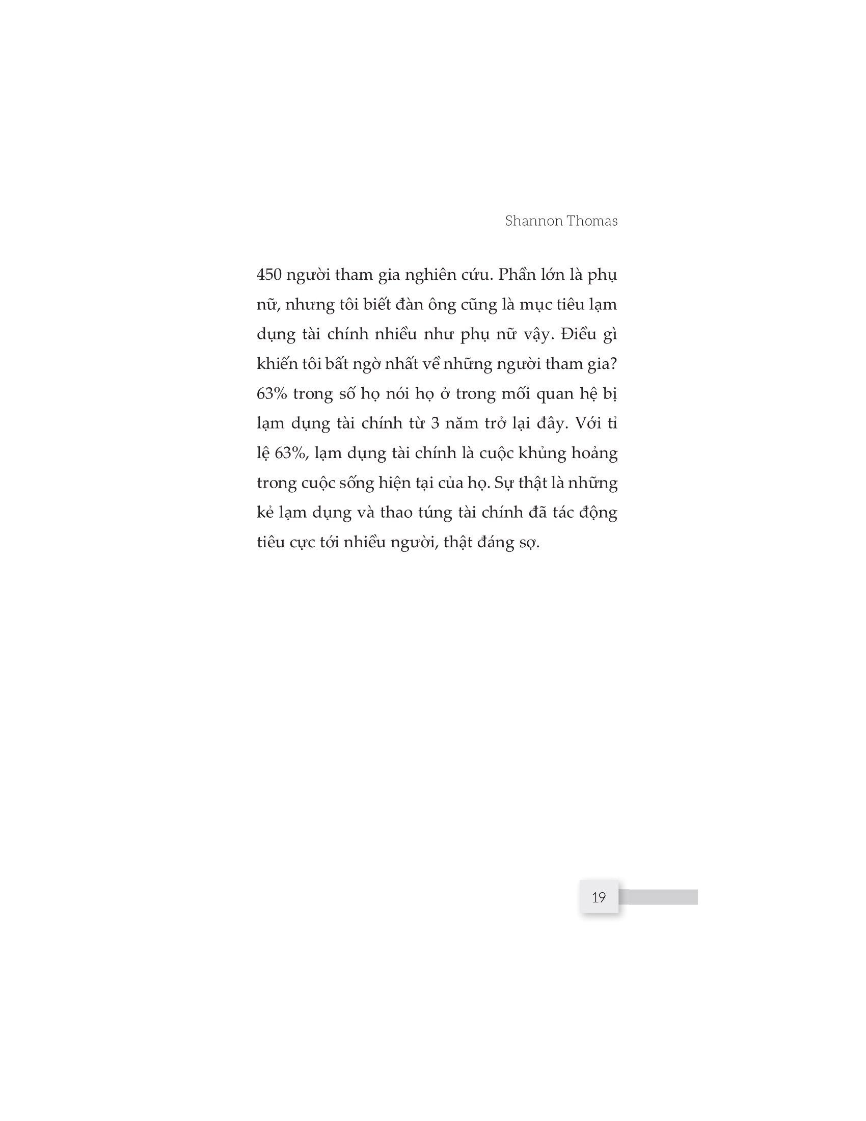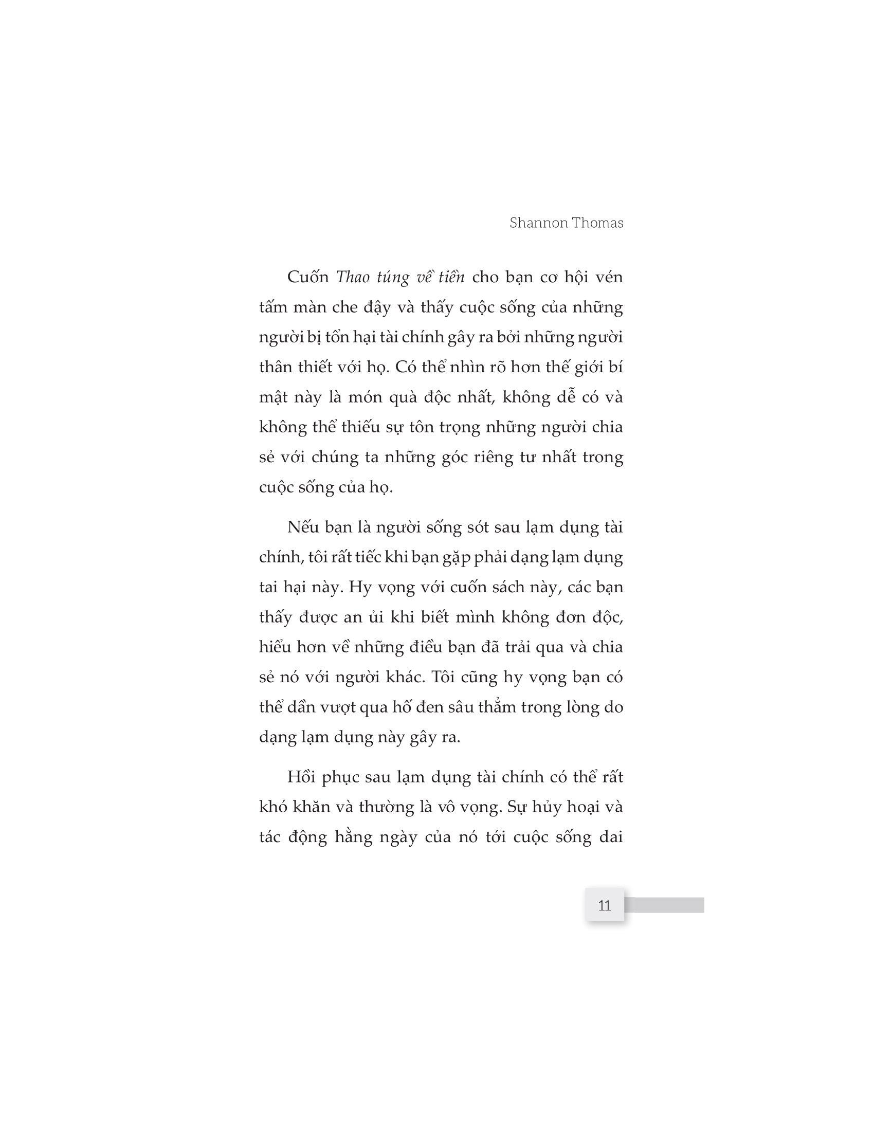 Cuốn sách “Thao túng về tiền” sẽ cho bạn cơ hội vén tấm màn che đậy và thấy được cuộc sống của những người bị tổn hại tài chính do những người thân thiết với họ gây ra. Nó cũng giúp bạn có được cái nhìn cụ thể và sâu sắc hơn về lạm dụng tài chính để nhận biết sớm, có hành động dứt khoát giúp bạn thoát khỏi hố sâu tâm lý và chữa lành những tổn thương tiềm ẩn.