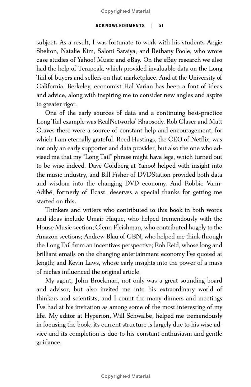 The Long Tail is a powerful new force in our economy: the rise of the niche. As the cost of reaching consumers drops dramatically, our markets are shifting from a one-size-fits-all model of mass appeal to one of unlimited variety for unique tastes. From supermarket shelves to advertising agencies, the ability to offer vast choice is changing everything, and causing us to rethink where our markets lie and how to get to them. Unlimited selection is revealing truths about what consumers want and how they want to get it, from DVDs at Netflix to songs on iTunes to advertising on Google.