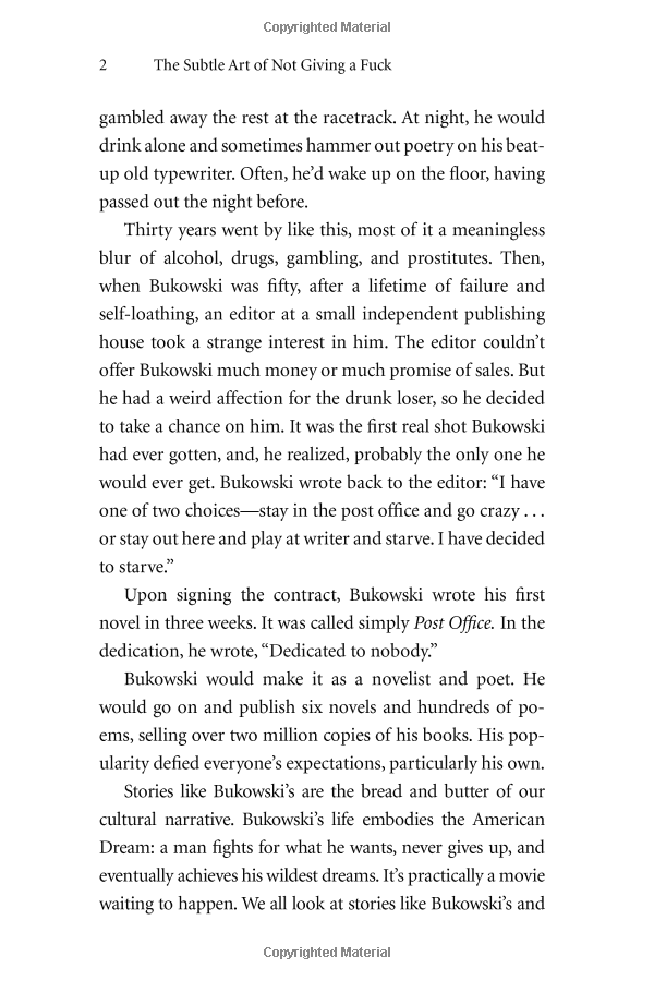 Manson makes the argument, backed both by academic research and well-timed poop jokes, that improving our lives hinges not on our ability to turn lemons into lemonade, but on learning to stomach lemons better. Human beings are flawed and limited—"not everybody can be extraordinary, there are winners and losers in society, and some of it is not fair or your fault." Manson advises us to get to know our limitations and accept them. Once we embrace our fears, faults, and uncertainties, once we stop running and avoiding and start confronting painful truths, we can begin to find the courage, perseverance, honesty, responsibility, curiosity, and forgiveness we seek.