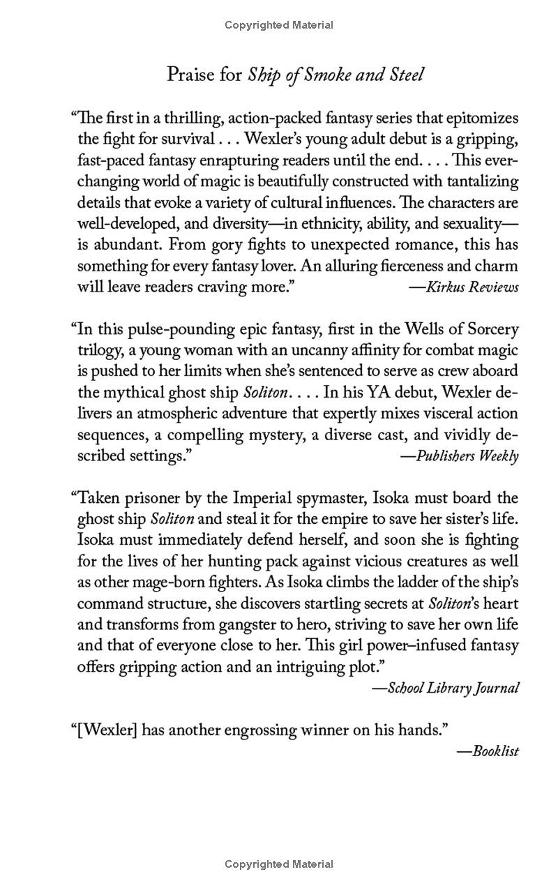 The Wells Of Sorcery Book 1: Ship Of Smoke And Steel Ship of Smoke and Steel is the launch of Django Wexler's cinematic, action-packed epic fantasy Wells of Sorcery trilogy. A FIERCE WARRIOR. HER DEADLY MAGIC.