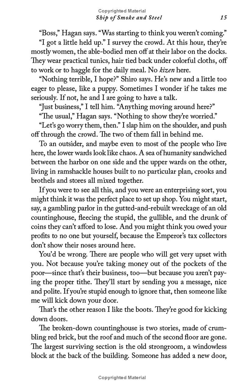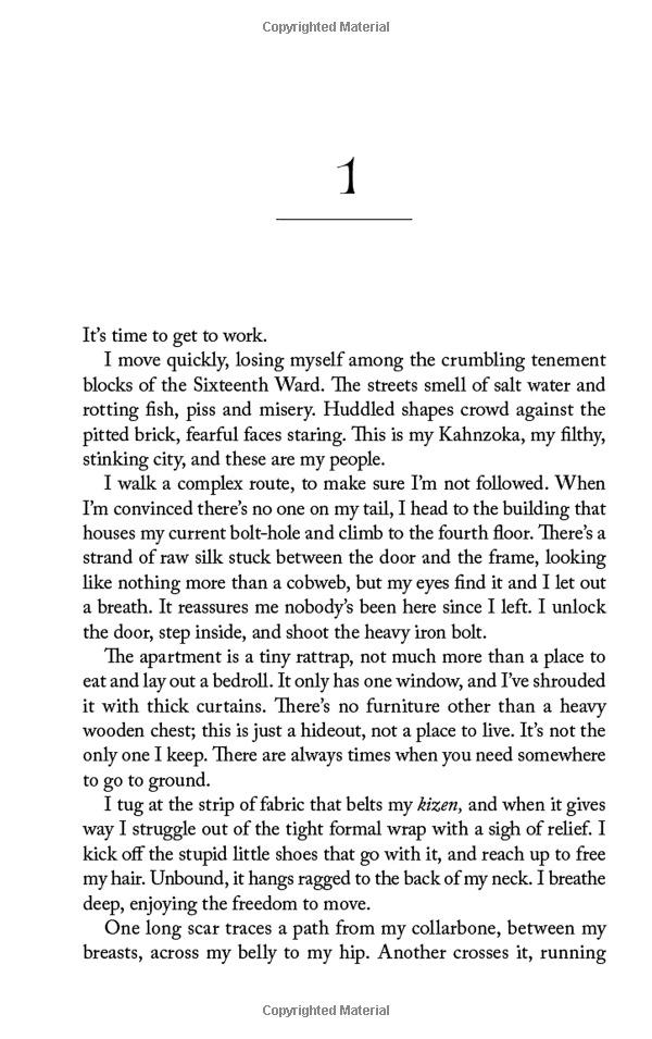 In the lower wards of Kahnzoka, the great port city of the Blessed Empire, eighteen-year-old ward boss Isoka enforces the will of her criminal masters with the power of Melos, the Well of Combat. The money she collects goes to keep her little sister living in comfort, far from the bloody streets they grew up on.