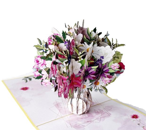 Mang đến sự tươi mới và bất ngờ với thiệp 3D Pop Up bình hoa nhiều màu sắc. Khi mở ra, hình ảnh bình hoa rực rỡ gồm nhiều loài hoa bung nở bật nổi