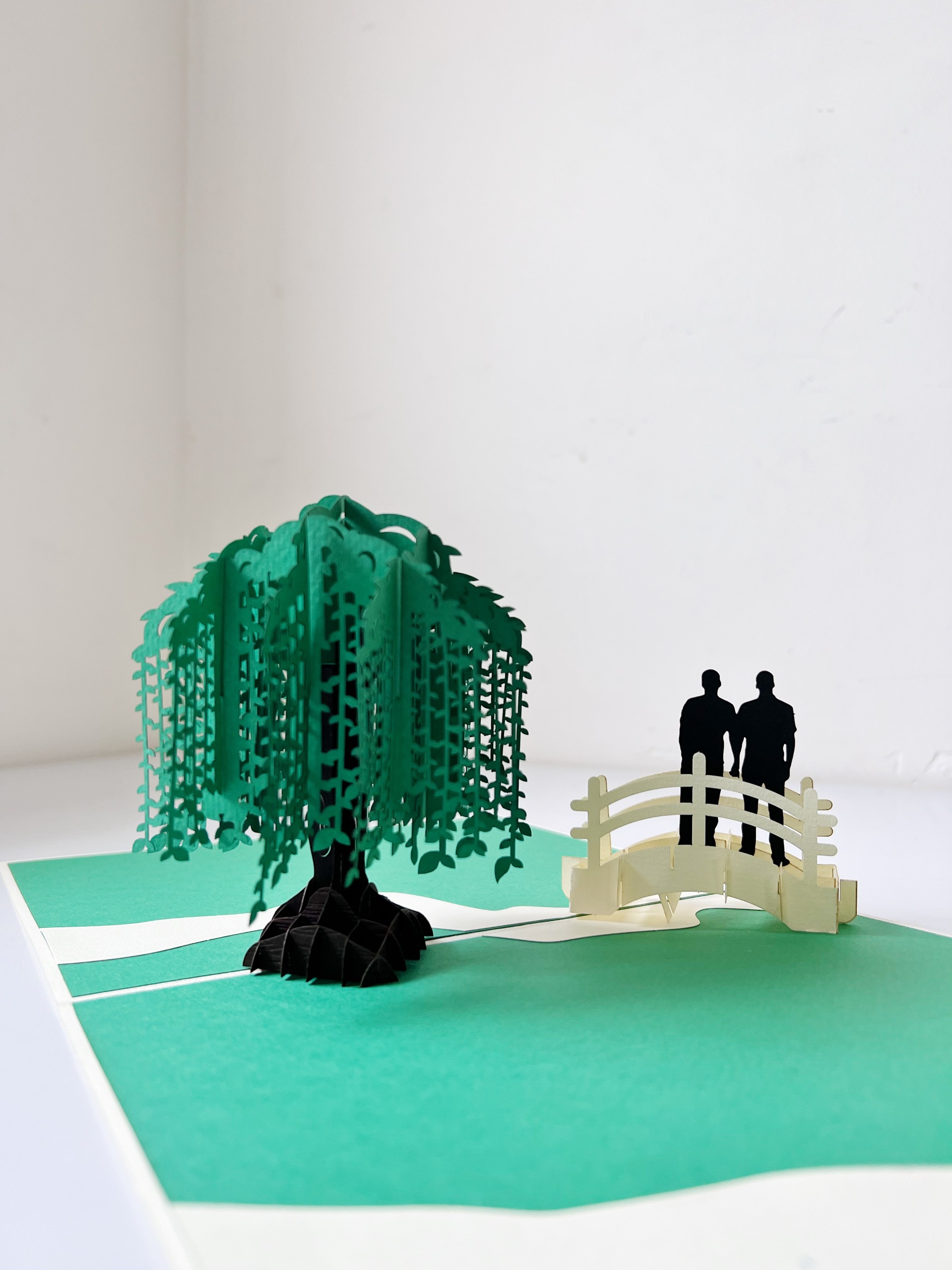Thiết kế 3D độc đáo: Cặp đôi LGBT trên cầu nhỏ dưới bóng cây liễu lãng mạn.