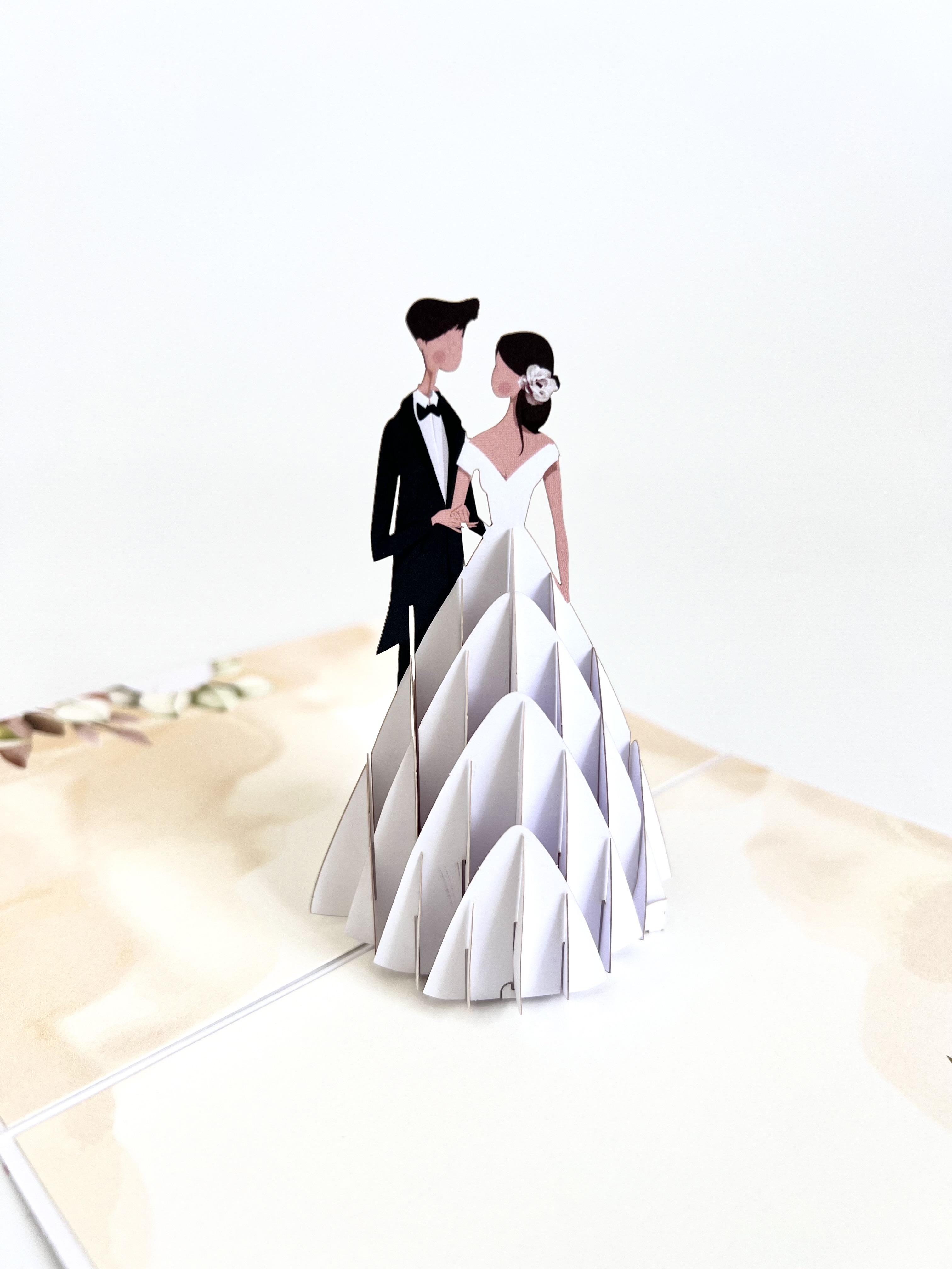 Gửi lời chúc phúc ý nghĩa với thiệp 3D Pop Up cô dâu váy trắng và chú rể. Khi mở ra, hình ảnh đôi uyên ương bật nổi, cô dâu trong chiếc váy trắng bồng