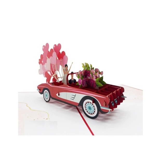 Tạo bất ngờ cho ngày trọng đại với thiệp 3D Pop Up xe cưới Just Married. Khi mở ra, chiếc xe cưới màu đỏ nổi bật bật lên đầy sống động, trang trí hoa tươi