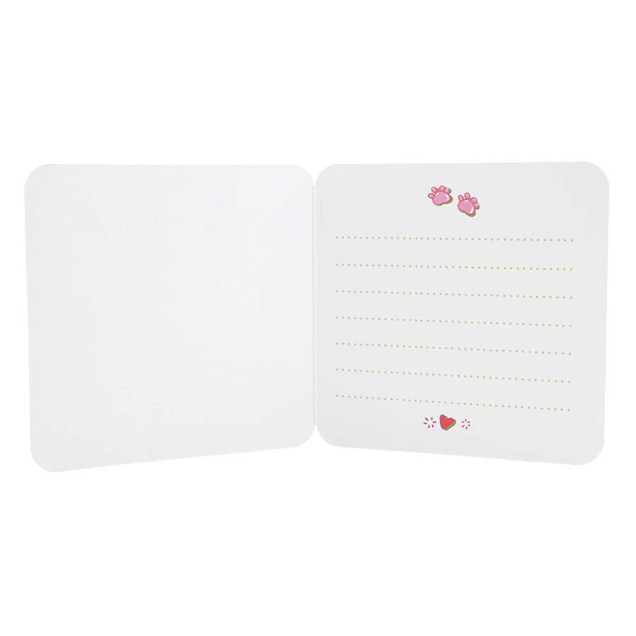 - Chất liệu giấy cao cấp, trơn mịn Thiết kế bên trong viết nội dung có in hình ảnh xinh xắn Họa tiết trang trí đơn giản, màu sắc bắt mắt Là quà tặng dễ