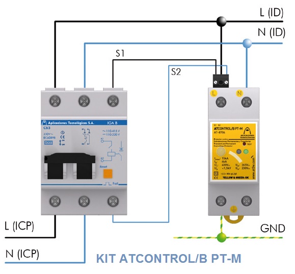 Thiết bị phải được lắp song song với nguồn điện hạ áp, phía sau MCB chính, kết nối các dây pha, trung tính và đất. Tiếp điểm phải được lắp nối tiếp phía sau thiết bị bảo vệ. Lắp đặt phải được thực hiện khi không có ngưồn điện trên dây