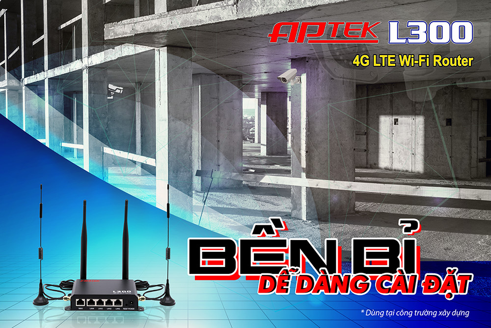 4G Wi-Fi Router APTEK L300 được thiết kế với một cổng Fast Ethernet WAN, RJ45, cung cấp tốc độ mạng tiêu chuẩn cho SOHO, hộ gia đình, văn phòên cạnh đó APTEK L300 còn được trang bị 4 cổng Fast Ethernet LAN, RJ45 cho phép kết nối thêm thiết bị hoặc mở rộng mạng dễ dàng. Số lượng cổng lớn giúp cho APTEK L300 là sự lựa chọn hoàn hảo cho việc triển khai camera ở công trường, nông trường Hiệu suất Wi-Fi cao, anten ngoài cho vùng phủ sóng mở rộng tối đa 4G Wi-Fi Router APTEK L300 trang bị 2 anten đa hướng chuẩn n giúp tốc độ đường truyền ổn định, phù hợp hộ gia đình, văn phòng, hoặc triển khai camera, internet cho những nơi khó đi dây như công trường, nông trường hoặc xe khách, tàu lử 4G Wi-Fi Router APTEK L300 giúp tận hưởng vùng phủ sóng Wi-Fi tin cậy, ở bất kỳ nơi đâu trong ngôi nhà hoặc văn phòng của bạn. Tốc độ wi-fi có thể lên đến 300Mbps. Bên cạnh đó 2 antena đa hướng dùng cho việc thu sóng 4G riêng biệt, giúp việc thu sóng tốt hơn, giúp đường truyền qua 4G/LTE ổn định hơn. Triển khai tại nông trường Đa ứng dụng, dễ dàng triển khai   4G Wi-Fi Router APTEK L300 với thiết kế nhỏ gọn, với 4 cổng Fast Ethernet LAN cộng với việc tích hợp thêm khe sim cho phép sử dụng kết nối 4G/LTE như đường truyền internet chính, cho phép APTEK L300 có thể sử dụng với nhiều mục đích khác nhau như triển khai internet, camera tại công trường, nông trường, trên xe hoặc hội chợ ngoài trờ Triển khai camera và internet tại công trường xây dựng Xe khách, hội chợ hoặc các nhà lưu động muốn cung cấp truy cập wi-fi miễn phí cho khách, 4G router wi-fi 4G Wi-Fi Router APTEK L300 là sự lựa chọn tối ưu, nó có thể được đặt ở một vị trí phù hợp để cung cấp vùng phủ sóng Wi-Fi tốt nhất. Với băng tần 2.4Ghz phù hợp cho tất cả thiết bị di động hiện nay, cũng như cung cấp vùng phủ sóng rộng, tốc độ wi-fi có thể lên đến 300Mbps.   Cài đặt dễ dàng 4G Wi-Fi Router APTEK L300 thừa hưởng những tính năng từ những người tiền nhiệm trước đó, giao diện điện thoại thân thiện với người dùng, giúp việc cấu hình trở nên dễ dàng nhanh chóng. Thiết kế tối ưu Thiết kế nhỏ gọn, với antena phát sóng wifi và antena thu sóng 4G/LTE có thể tháo rời, bạn có thể dễ dàng di chuyển mà không gặp vấn đề gì. Bên cạnh đó sản phẩm còn được hoàn thiện với lớp vỏ bằng thép sơn đen chống gỉ sét giúp sản phẩm chắc chắn, chịu được va đập và môi trường khắc nghiệt.