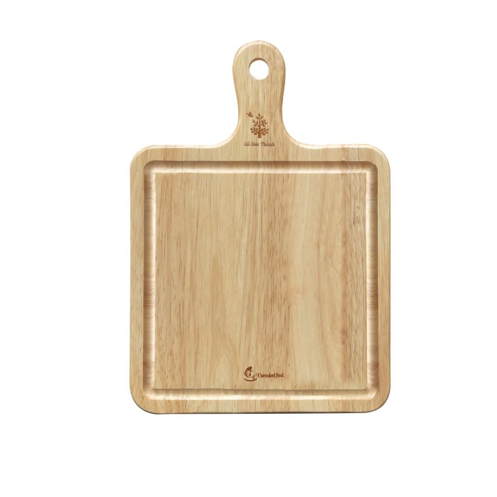 Thớt gỗ hình vuông có tay cầm dùng cắt thái, decor | Gỗ Đức Thành 06433 được làm từ gỗ cao su đã qua xử lý chống mối mọt, loại bỏ các tạp chất có trong gỗ, chỉ chọn những thanh gỗ đẹp để sản xuất thớt. Thớt có màu sáng, bề mặt láng mịn, thuận tiện cho việc sử dụng cắt thái thực phẩm, trang trí bàn ăn, đồng thời giúp dễ dàng vệ sinh sản phẩm sau khi dùng.