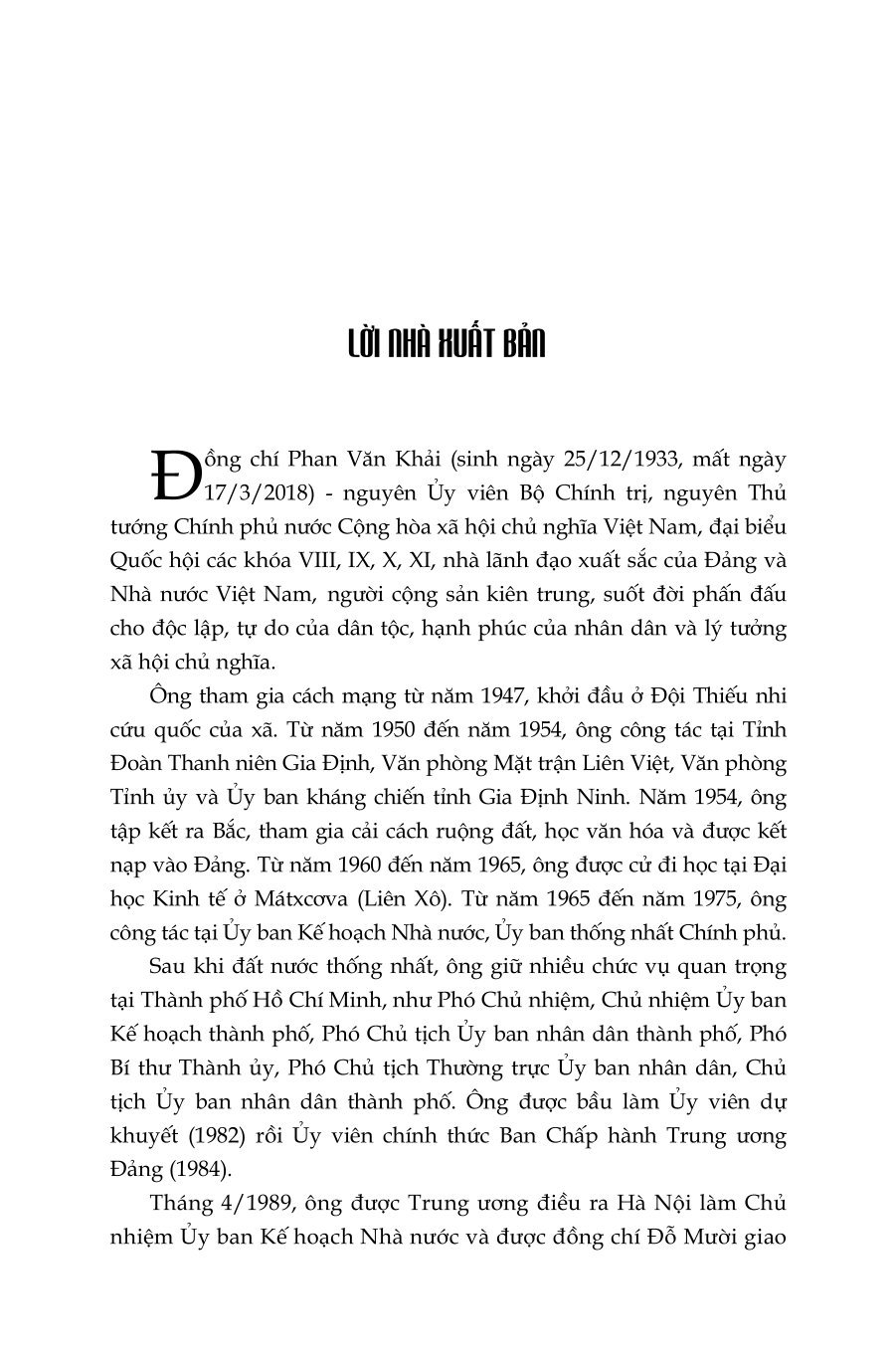 Cuốn sách gồm 3 phần, tuyển chọn những bài phát biểu, bài viết, báo cáo, văn bản chỉ đạo, góp ý, bút tích phê duyệt, của đồng chí Phan Văn Khải trên cương vị là Phó Chủ tịch Hội đồng Bộ trưởng, Phó Thủ tướng Chính phủ, Thủ tướng Chính phủ trong khoảng thời gian từ năm 1992 đến năm 2006. Các bài viết tập trung vào các lĩnh vực kinh tế, văn hóa, xã hội, ngoại giao, được tập hợp theo chủ đề và trình tự thời gian, diễn biến của sự việc, sự kiện. Các tài liệu được công bố toàn văn hoặc lược trích, chú giải rõ nguồn.