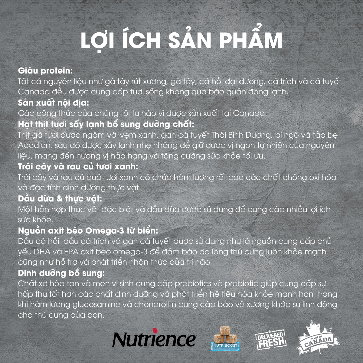 - THÀNH PHẦN NGUYÊN LIỆU: Thịt gà rút xương, gà tây rút xương, bột thịt gà, bột thịt gà tây, cá hồi, gan gà, tim gà, gan gà tây, tim gà tây, cá trích, cá tuyết, gan cá tuyết, trứng, đậu Hà Lan, mỡ gà (được bảo quản bằng hỗn hợp tocopherols – nhóm chất quan trọng có trong Vitamin E), đậu lăng đỏ, khoai lang, đậu gà, vị thịt gà tự nhiên, bột cỏ linh lăng, thịt gà sấy đông lạnh, bí ngô sấy đông lạnh, gan gà sấy đông lạnh, vẹm vỏ xanh sấy đông lạnh, gan cá tuyết sấy đông lạnh, tảo bẹ sấy đông lạnh, dầu cá hồi, dầu cá trích, dầu dừa, bí ngô, bí nghệ, cà rốt, rau bina, bông cải xanh, táo, việt quất, nam việt quất, lựu, chiết xuất từ quả cây bách xù, gừng, thì là, hoa cam cúc, lá bạc hà, rễ cam thảo, nghệ, rễ cây nữ lang, Vitamin tổng hợp Xuất xứ Canada HSD: 12 tháng từ ngày sản xuất trên bao bì