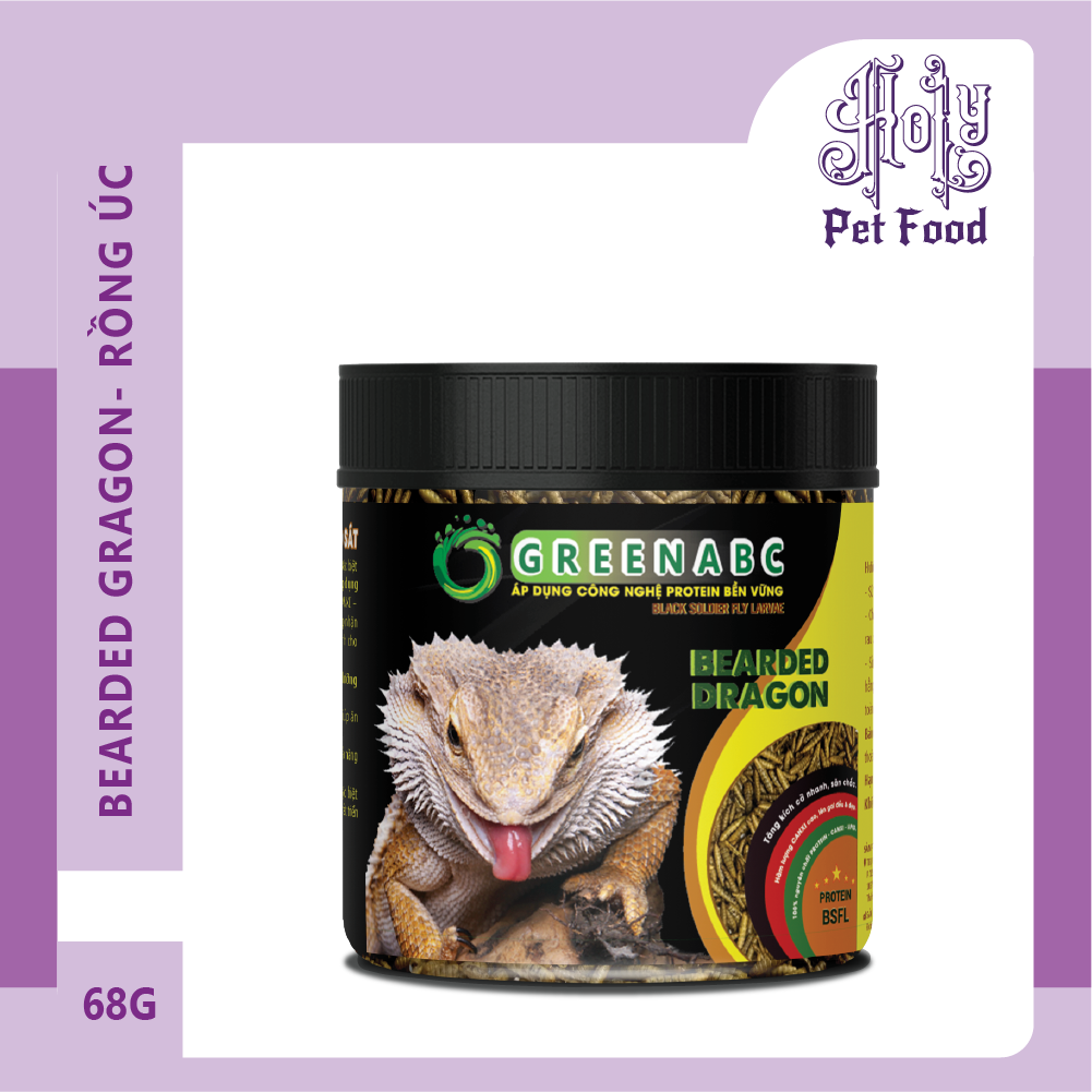 THỨC ĂN RỒNG ÚC, RỒNG RÂU - BỔ SUNG DINH DƯỠNG PROTEIN, CANXI, LIPID GREENABC là thức ăn cao cấp dành cho các loại Rồng Úc, Rồng Râu. Đặc biệt sản phẩm GREENABC được sản xuất theo phương pháp Áp dụng công nghệ PROTEIN BỀN VỮNG từ bột đạm G.Meal rất giàu PROTEIN–CANXI–LIPID có trong BSFL*, đã được Mỹ (AAFCO) và EU chấp nhận đưa vào công thức cho ngành sản xuất thức ăn dành cho thú cưng. Sản phẩm GREENABC cung cấp các giá trị dinh dưỡng bền vững cho thú cưng, giúp cho Rồng Râu / Úc:       + Kích thích vị giác, đặc biệt trong thời kì sinh sản giúp ăn ngon miệng hơn.       + Tăng cường sức đề kháng ngăn ngừa bệnh tật, tăng khả năng sinh sản.       + Tiêu hóa tốt, cơ thể hấp thu các dưỡng chất tối ưu. Đặc biệt với hàm lượng Canxi cao, sản phẩm GREENABC giúp cơ thể phát triển toàn diện về khung xương, gai đều.       + Kích thích sắc tố, giúp Rồng Úc lên màu đẹp.       + Cơ thể cân đối, săn chắc. Phân loại & hướng dẫn sử dụng sản phẩm: + Rồng Úc 68g: cho bé sử dụng hằng ngày như 1 món ăn yêu thích + Combo Rồng Úc 1, Combo Rồng Úc 2: => Rồng Úc 68g: cho bé sử dụng hằng ngày như 1 món ăn yêu thích => Thức ăn Bổ Sung Dinh Dưỡng 40g / 200g: tập thói quen cho bé ăn rau, trái cây hằng ngày, vì sản phẩm khi rắc lên rau, trái cây rất kích thích khứu giác và vị giác ăn ngon miêng. Lưu ý: khi sử dụng GREENABC - Thức ăn dinh dưỡng dành cho Thằn Lằn Da Báo, KHÔNG CẦN BỔ SUNG THÊM CANXI cho các bé. Vì sản phẩm có đầy đủ dưỡng chất PROTEIN - CANXI - LIPID có từ BSFL