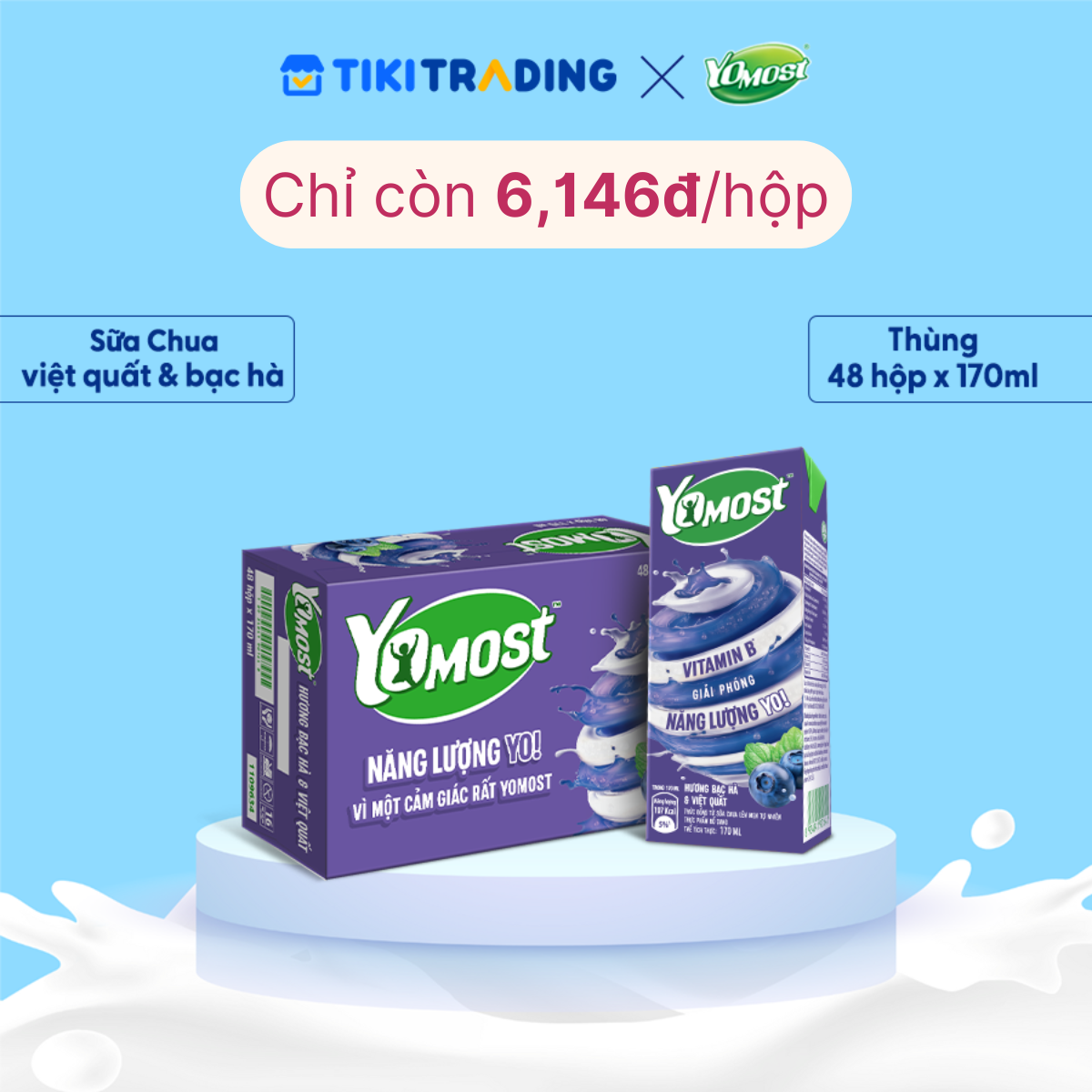 Mua tại Tiktok- Thùng 48 Hộp Sữa Chua Lên Men Tự Nhiên Yomost Bạc Hà - Việt Quất được làm từ sữa chua lên men tự nhiên kết hợp cùng hương vị cam tươi tự nhiên thơm ngon, giúp cung cấp nhiều loại dưỡng chất cần thiết cho cơ thể như protein, canxi và vitamin cho cơ thể.