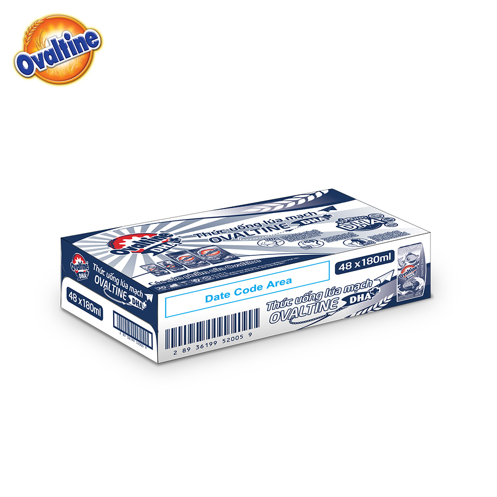 THỨC UỐNG LÚA MẠCH HƯƠNG VỊ SÔ-CÔ-LA OVALTINE DHA+ 180ML (Thùng 48 Hộp) Ovaltine mới gấp 4 lần canxi (so với sản phẩm Ovaltine trước tháng 7 2021) "Ovaltine" là nhãn hiệu thuốc quyền sở hữu của Công ty R Twinning and