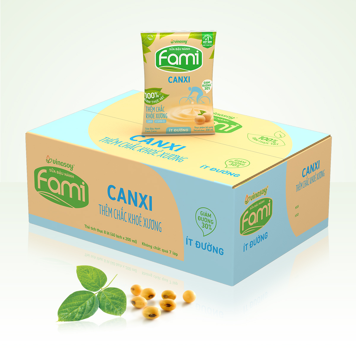- Sữa đậu nành Fami Canxi Plus cùng công thức Bộ 3 Chắc Khỏe bổ sung Nano Canxi, Glucosamin và Protein thực vật hỗ trợ cho bạn có một hệ cơ - xương - khớp
