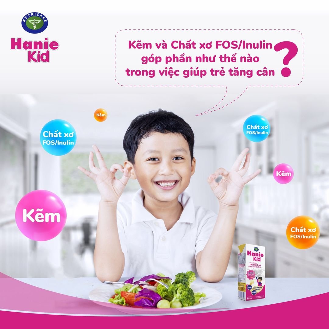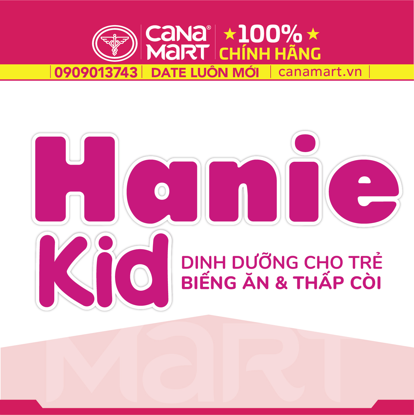 DINH DƯỠNG CHO TRẺ BIẾNG ĂN VÀ SUY DINH DƯỠNG           TÁCH BƯỚC PHÙ HỢP DINH DƯỠNG LỨA TUỔI         HỆ DƯỠNG CHẤT 5PRO MỚI TỐI ƯU CÔNG DỤNG         TĂNG CẢM GIÁC NGON MIỆNG, GIẢM BIẾNG ĂN Kẽm, Lysine cùng Vitamin nhóm B kích thích bé ăn uống ngon miệng hơn, giúp giảm tình trạng biếng ăn ở trẻ BỘ BA CANXI NANO, D3, K2 Canxi Nano có kích thước siêu nhỏ so với canxi thường giúp xương dễ dàng hấp thu. Vitamin D3 giúp hấp thu Canxi từ ruột vào máu Vitamin K2 gắn Canxi trực tiếp từ máu vào xương, tham gia vào quá trình chuyển hóa xương, làm xương chắc khỏe và trẻ tăng trưởng chiều cao tốt hơn   TĂNG ĐỀ KHÁNG, MIỄN DỊCH TỰ NHIÊN Sản phẩm sữa dành cho trẻ suy dinh dưỡng duy nhất chứa Sữa non giúp tăng miễn dịch tự nhiên của trẻ Hệ antioxidant (A, C, E, Kẽm, Selen) chống lại sự phát triển của các gốc tự do, giúp bé Tăng cường đề kháng, khỏe mạnh     HỖ TRỢ TIÊU HÓA KHỎE MẠNH Trong số các chất dinh dưỡng trong sữa mẹ thì HMO 2’-FL nhiều thứ 3 HMO 2’-FL có vai trò quan trọng trong sự phát triển của trẻ, đặc biệt là duy trì sự khỏe mạnh của hệ vi sinh đường ruột. HMO 2’-FL kết hợp cùng lượng chất xơ dồi dào trong Hanie Kid giúp tăng cường hoạt động của hệ thống miễn dịch giảm tình trạng nhiễm trùng nói chung và nhiễm khuẩn đường hô hấp vốn là các bệnh thường gặp ở trẻ nhỏ. So với các sản phẩm trên thị trường, Hanie Kid có lượng HMO cao nhất(25mg/100g bột)     HỖ TRỢ PHÁT TRIỂN TRÍ NÃO DHA giúp phát triển não bộ Axit Folic giúp tăng cường khả năng ghi nhớ, học hỏi của trẻ     ĐIỂM KHÁC BIỆT CỦA SẢN PHẨM Năng lượng chuẩn khuyến nghị Tổ chức Y tế thế giới Trong dòng sản phẩm đặc trị biếng ăn, suy dinh dưỡng, Hanie Kid: Duy nhất bổ sung Sữa non (Colostrum) Duy nhất sử dụng Canxi Nano Hàm lượng DHA cao nhất Hàm lượng HMO cao nhất     Sản phẩm đạt chứng nhận hệ thống quản lý An toàn thực phẩm ISO 22000:2005. Hệ thống thực hành sản xuất tốt HACCP số TNĐKSP của Bộ Y Tế Thương nhân chịu trách nhiệm: Công ty TNHH Dinh Dưỡng Nutricare