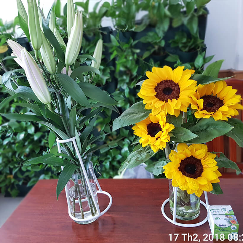 • Hoa cắm bình có dùng gói dưỡng hoa tươi lâu Long Life sẽ tươi lâu hơn gấp 2 đến 3 lần và lá hoa luôn xanh cứng