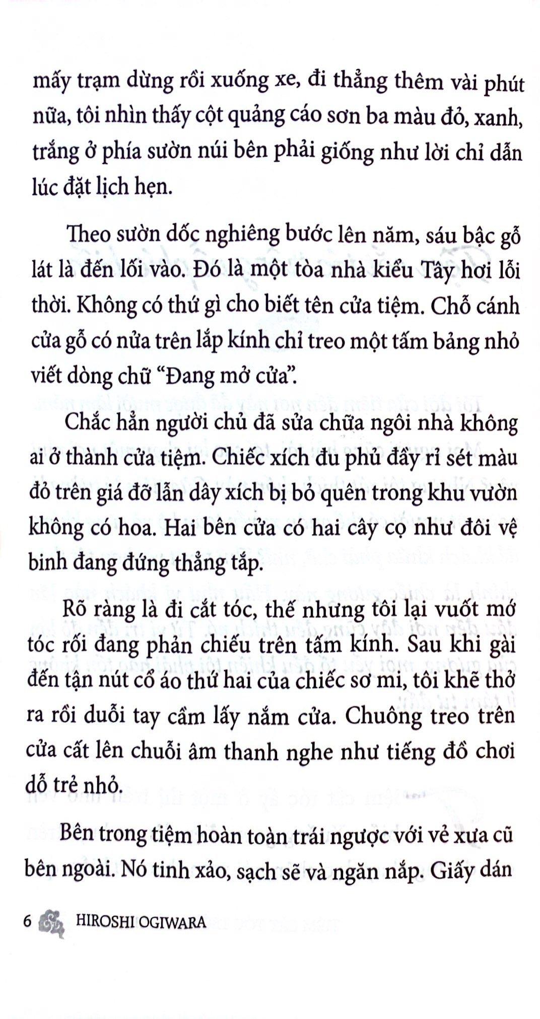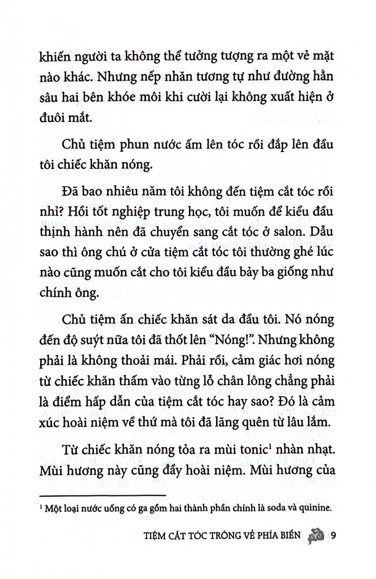 "Con người ta, khi làm một công việc trong suốt thời gian dài, đặc biệt là làm đi làm lại những tác vụ đơn giản, đầu óc được thả lỏng sẽ bắt đầu suy nghĩ, khiến những thứ như kinh doanh, cuộc đời, triết học nhen nhóm trong tư tưởng. Bằng cái đầu chỉ biết hất lên trời mà không còn biết nhìn xuống đất, tôi bắt đầu suy nghĩ Rằng người ưu tú như tôi đây còn phải làm tiếp tục làm công việc cạo râu, gội đầu cho kẻ khác tới bao giờ nữa? Có lẽ tôi đã không phân biệt được con người mình muốn trở thành với con người thực của mình. Quý khách này, nếu định phát triển sự nghiệp, tôi mong bạn hãy chú ý. Cho dù công ty có lớn tới đâu đi nữa, hãy luôn giữ trong mình sơ tâm. Đó mới là lựa chọn sáng suốt." (Trích: Tiệm cắt tóc trông về phía biển)