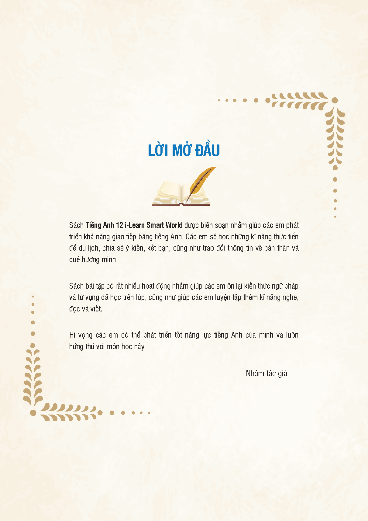 Mua tại TiktokTiếng Anh i-Learn Smart World là khóa học tiếng Anh dành cho học sinh THPT. i-Learn Smart World đã được phát triển bởi một đội ngũ giàu kinh nghiệm gồm các nhà văn, giáo viên quốc tế và Việt Nam để trở nên hoàn hảo cho lớp học Việt Nam và bao gồm đầy đủ chương trình giảng dạy quốc gia của Việt Nam và Khung Tham chiếu Ngôn ngữ Chung Châu Âu (CEFR). Tiếng Anh 12 i-Learn Smart World đã được Bộ Giáo dục và Đào tạo thẩm định và phê duyệt.