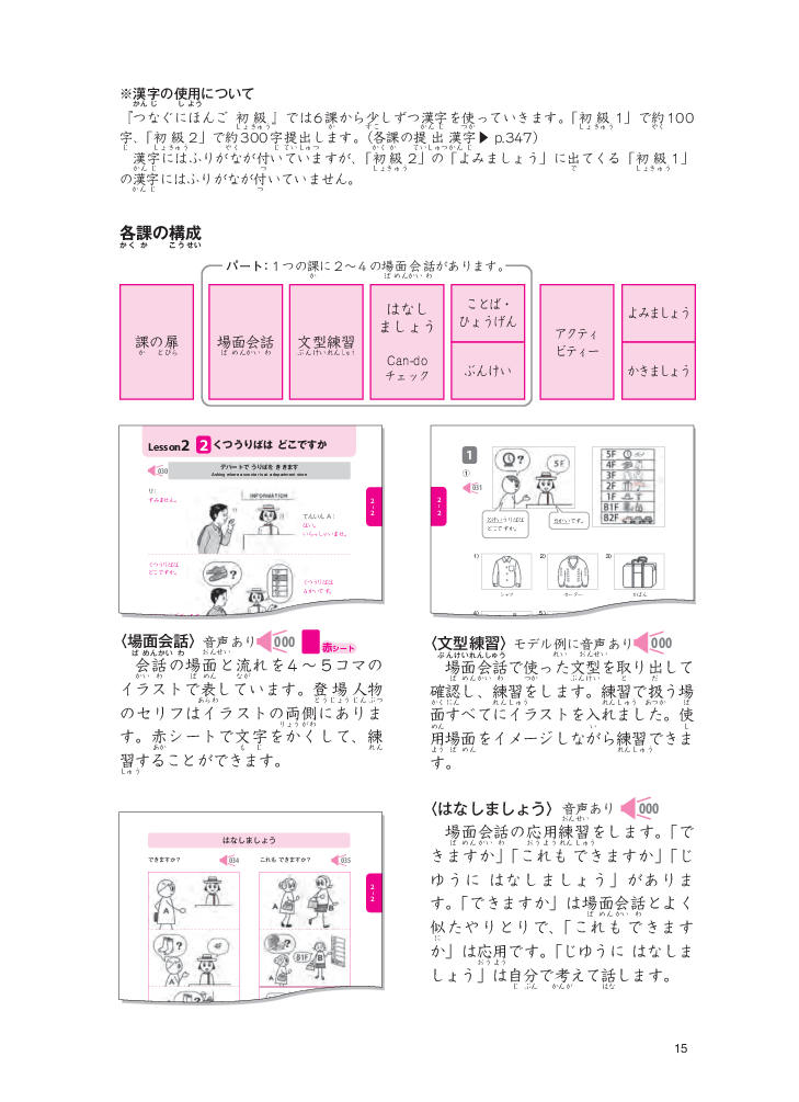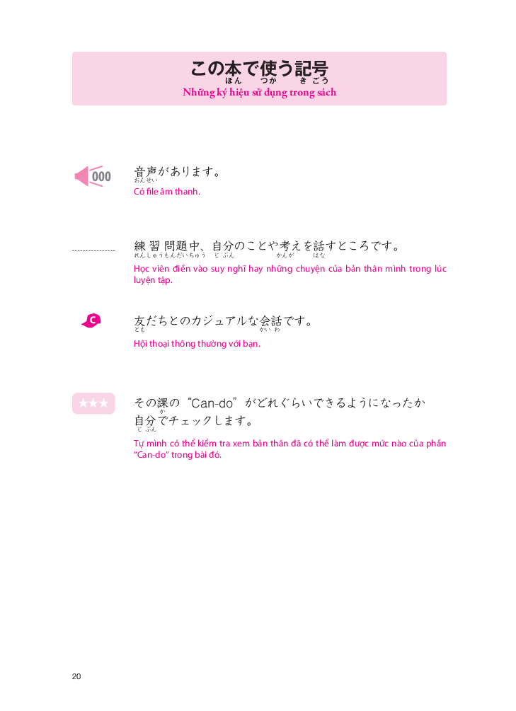 Giáo trình được biên soạn nhằm giúp người học giao tiếp bằng tiếng Nhật tốt hơn trong các hoạt động xã hội. Các tình huống học tập trong giáo trình là những tình huống thường được sử dụng để giao tiếp trên thực tế, được lựa chọn từ các lĩnh vực trong đời sống sinh hoạt, trường học và xã hội. Cách học được tổ chức theo hình thức đặc biệt ưu tiên việc "Giao tiếp" hơn là "Hiểu" từ vựng và ngữ pháp. [Hội thoại tình huống -> Xác nhận mẫu câu -> Luyện tập mẫu câu -> Hội thoại ứng dụng] Giáo trình bao gồm 2 sách giáo khoa sơ cấp 1, 2, hai quyển Work book sơ cấp 1,2 và 1 quyển Bản dịch và giải thích ngữ pháp.