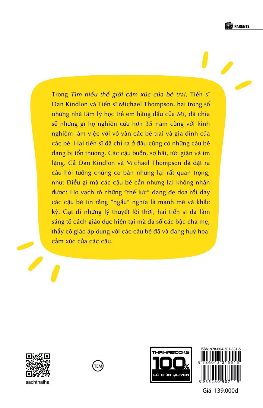 Mua tại TiktokTrong Tìm hiểu thế giới cảm xúc của bé trai, Tiến sĩ Dan Kindlon và Tiến sĩ Michael Thompson, hai trong số những nhà tâm lý học trẻ em hàng đầu của Mĩ, đã chia sẻ những gì họ nghiên cứu hơn 35 năm cùng với kinh nghiệm làm việc với vô vàn các bé trai và gia đình các bé.